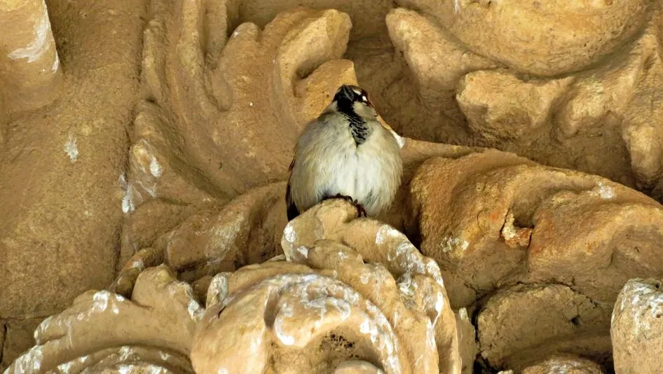 Ella solo está ahí, descansando del vuelo. Y aporta una serenidad inocente a esta piedra labrada, para darle algo de vida a esta belleza que acaso nadie observa, pero que dignifica la realidad del mundo.