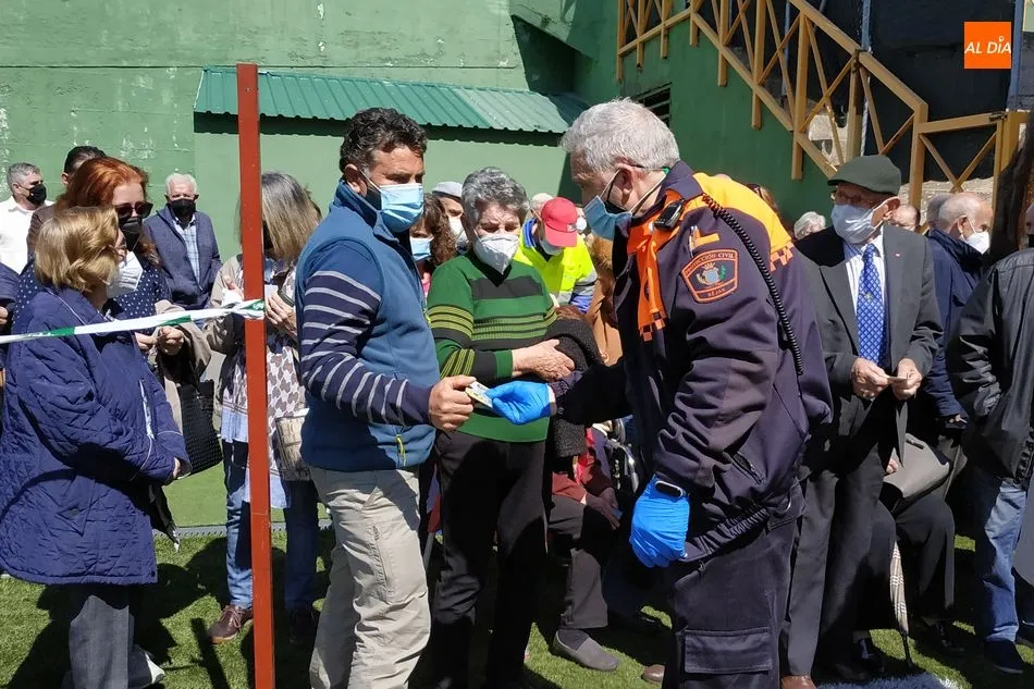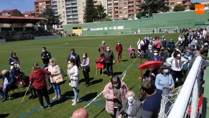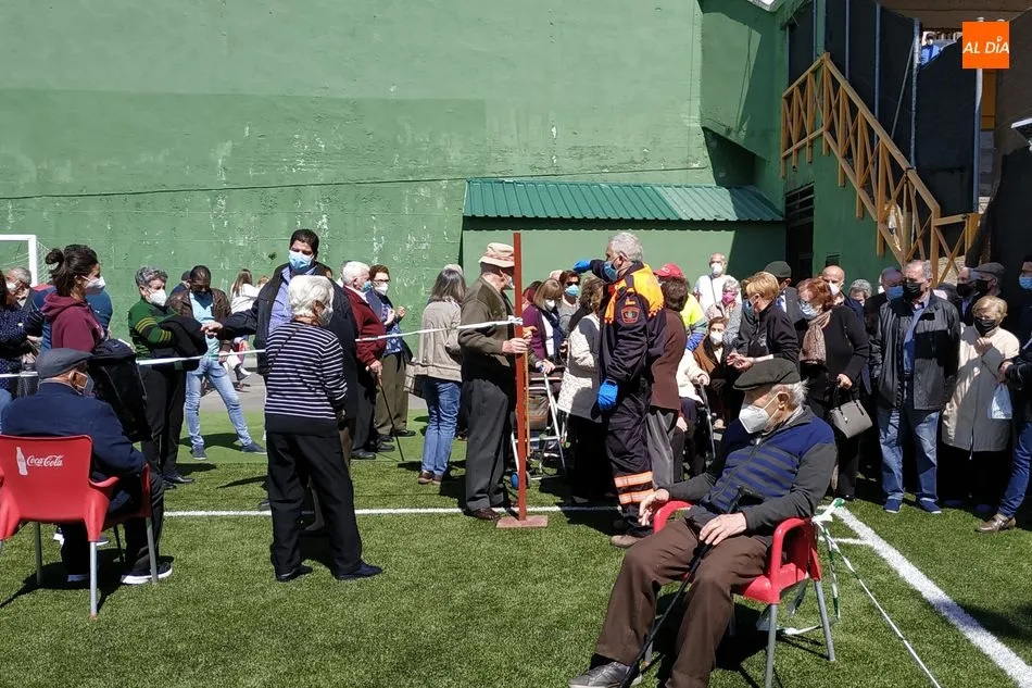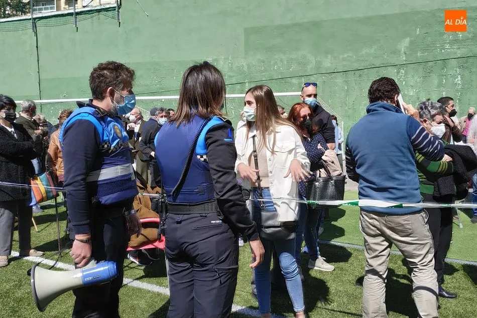 Las aglomeraciones en el exterior y las quejas han sido la tónica durante la mañana, debido a la gran cantidad de gente que tenía que vacunarse hoy, pero también por la falta de respeto a los turnos de muchas personas que han acudido antes de la hora establecida en función del año de nacimiento. Policía Local y Protección Civil han estado toda la mañana tratando de poner orden en las colas para distribuir a la gente lo más separada posible, una ardua tarea que han resuelto en parte colocando en las gradas del campo de fútbol a las personas en función de los diferentes tramos de edad.