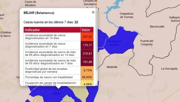 Hoy domingo, 11 de abril de 2021, en Béjar se contabilizan 22 nuevos casos de coronavirus en los últimos siete días. La incidencia acumulada (IA) de casos diagnosticados en 14 días sube situándose en 207?02, nivel de riesgo alto, la de la provincia sube también respecto al jueves pasado situándose en 153?68. La IA en siete días se incrementa en Béjar de 111?47 del jueves a 175?17, entrando en nivel de riego muy alto, este dato en la provincia es de 95?37.