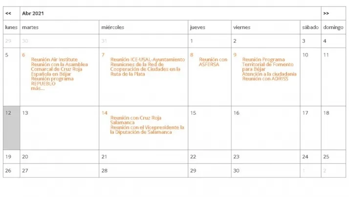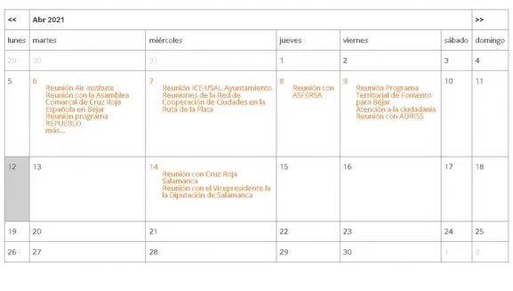 La agenda de la Alcaldesa de Béjar publicada en la web del Ayuntamiento, está vacía de contenido para hoy lunes y mañana martes, recoge dos reuniones el próximo miércoles, una con duración de todo el día sin hora determinada con Cruz Roja de Salamanca y otra de 13.00 a 14.00 h. con el Vicepresidente de la Diputación Provincial.