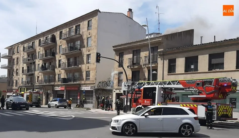 Susto en el paseo de Canalejas por el incendio en el interior de un edificio | Imagen 1Unos minutos antes de la 14.00 horas de este lunes se avisaba al Servicio de Municipal de Extinción de Incendios por el abundante humo que salía por una ventana del primer piso y una parte del tejado del edificio ubicado en el número 184 del paseo de Canalejas, frente al cruce con la calle Jardines.