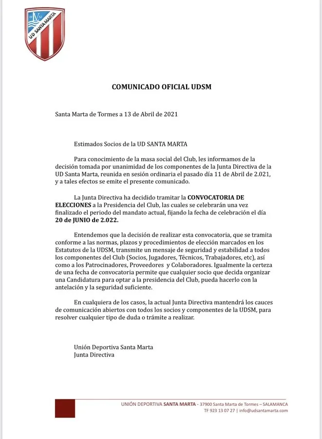 La Junta Directiva del Santa Marta ha decidido tramitar la convocatoria de elecciones a la presidencia del club, que se celebrarán una vez finalizado el período del mandato actual, fijando la fecha de celebración el día 20 de junio de 2022, por lo que aún queda más de un año para que se produzca dicho hecho.