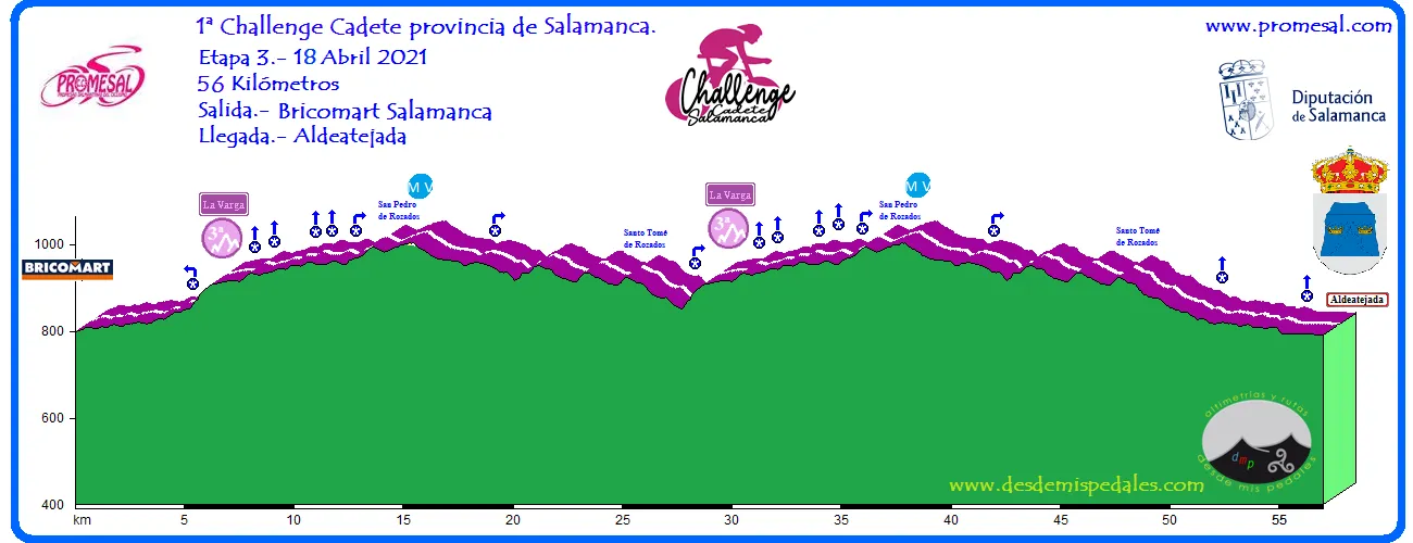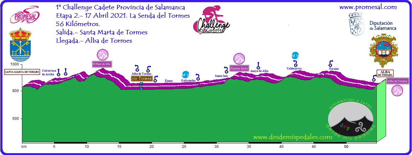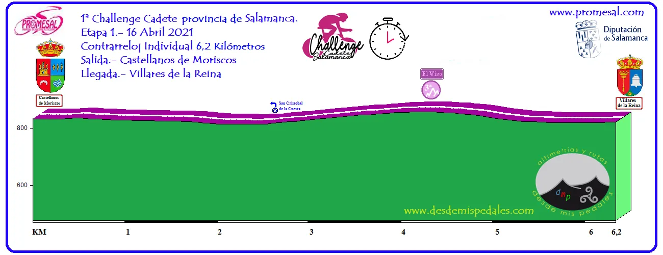Los chavales harán dos vueltas a este trazado para finalizar la etapa, y la vuelta en Aldeatejada. Los mejores equipos de categoría cadete de España estarán presentes en esta primera edición, que solo espera los permisos oportunos de la Junta de CyL y que no suba la incidencia del Covid para dar el banderazo de salida de esta novedosa prueba por etapas que el Club Deportivo Ciclista PROMESAL organiza para el disfrute del entendido aficionado charro al ciclismo.