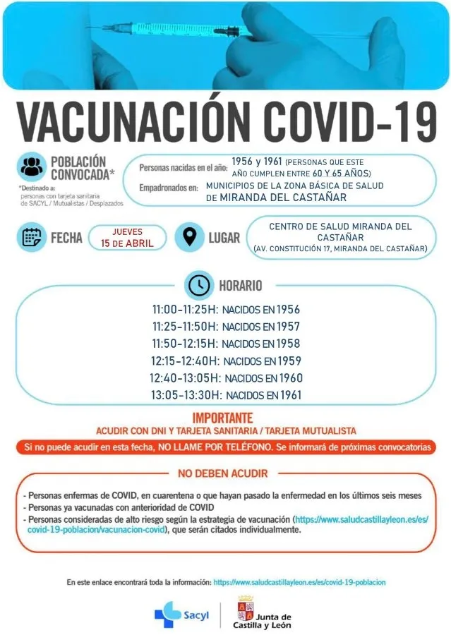 Esta información se facilitará por todos los canales disponibles, medios de comunicación, redes sociales y carteles informativos. Los convocados deberán asistir a los puntos de vacunación con su DNI y su tarjeta sanitaria. Las personas que no puedan acudir a este llamamiento serán avisadas posteriormente para poder vacunarse.