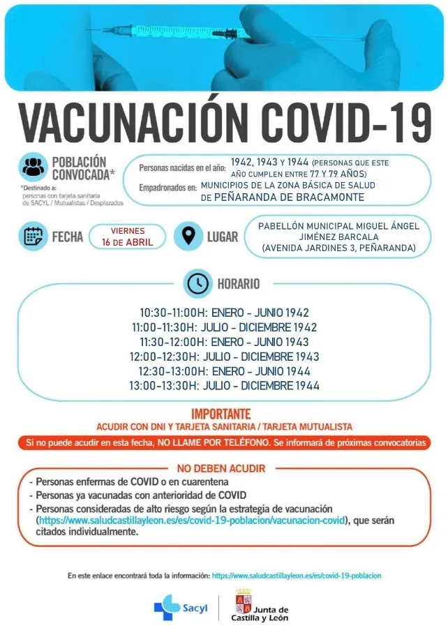 Peñaranda de Bracamonte acogerá la vacunación masiva el viernes 16 destinada a personas nacidas entre 1942 y 1944, es decir, que este año cumplen entre 77 y 79 años, empadronados en la Zona Básica de Salud de Peñaranda. Tendrá lugar en el pabellón municipal Miguel Ángel Jiménez Barcala en horario de mañana entre las 10:30 y las 13:30 horas.