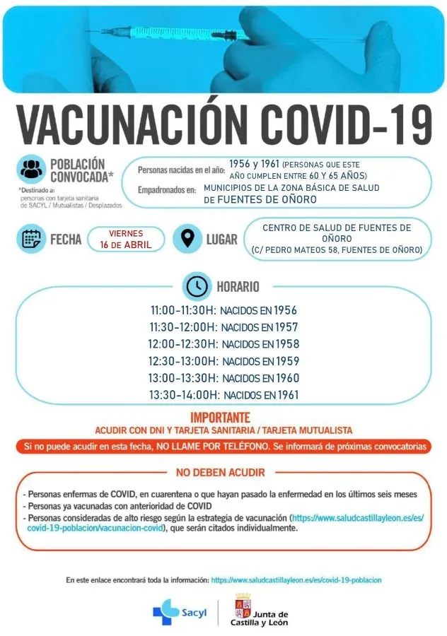 Por último, el viernes 16 se vacunará en Fuentes de Oñoro a personas nacidas entre 1956 y 1961, es decir, que este año cumplen entre 60 y 65 años, empadronadas en la Zona Básica de Salud de Fuentes de Oñoro. Tendrá lugar en el centro de salud en horario de mañana entre las 11:00 y las 14:00 horas.