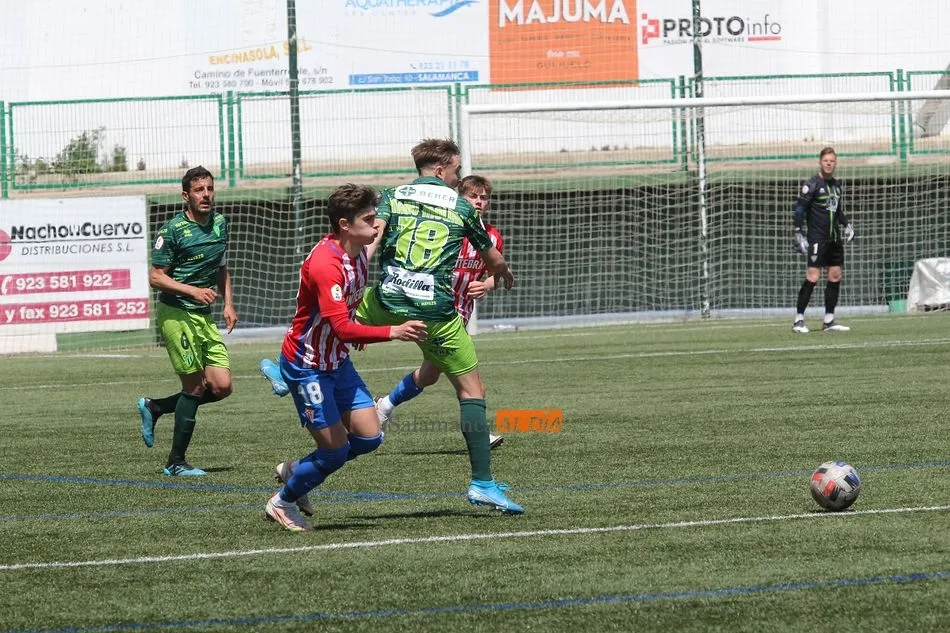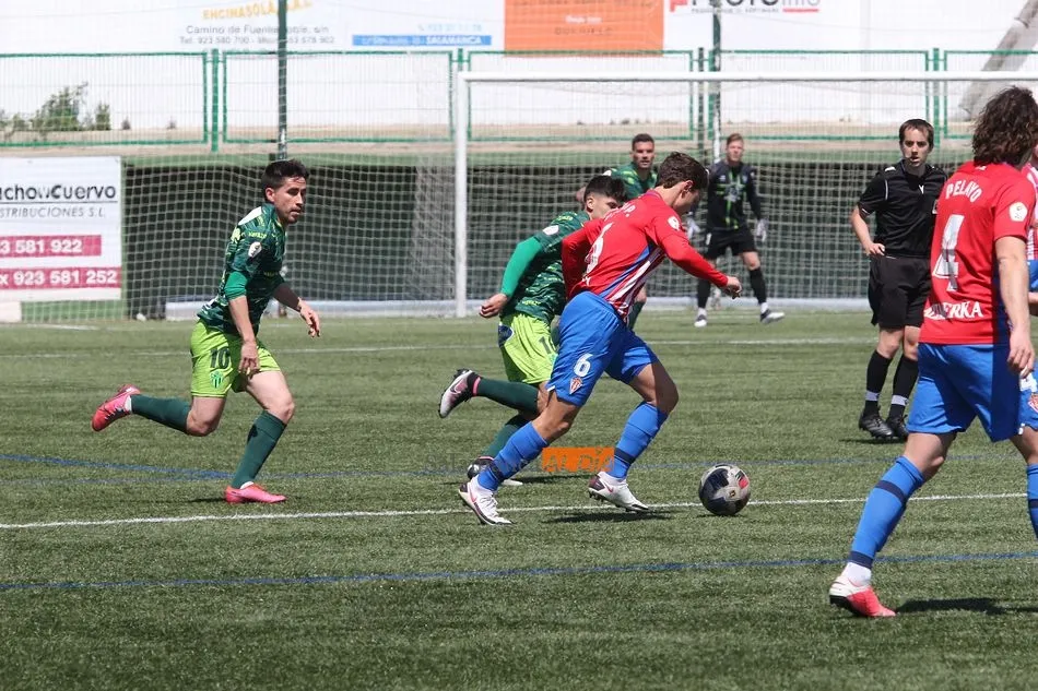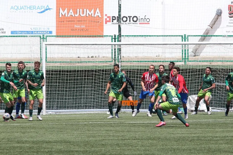 El encuentro se inició con un Guijuelo seguro de sí mismo y con ganas de cambiar la suerte en el Municipal en esta segunda fase. Lolo Plá protagonizó la primera ocasión del encuentro con un balón procedente de Pino que mandó cerca de la puerta del Sporting. Pese al buen arranque, ambos conjuntos no terminaban de hacer suyo el encuentro, con un Guijuelo con voluntad pero sin peligro en los últimos metros. La primera mitad transcurrió sin mucho que resaltar de cara a portería, con poco trabajo para ambos guardametas.