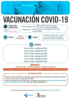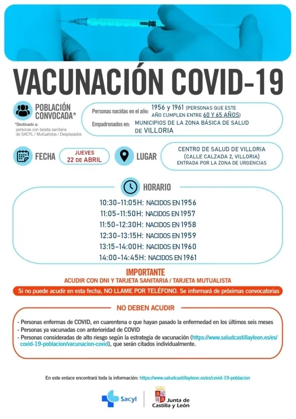 Este jueves se realizará la vacunación de las personas que cumplen entre 60 y 65 años en el centro de salud de Villoria. Las personas nacidas entre 1956 y 1961 con tarjeta sanitaria en la zona básica de salud de Villoria son convocadas para recibir la vacuna contra el Covid19 desde las 10:30 hasta las 14:45 horas.