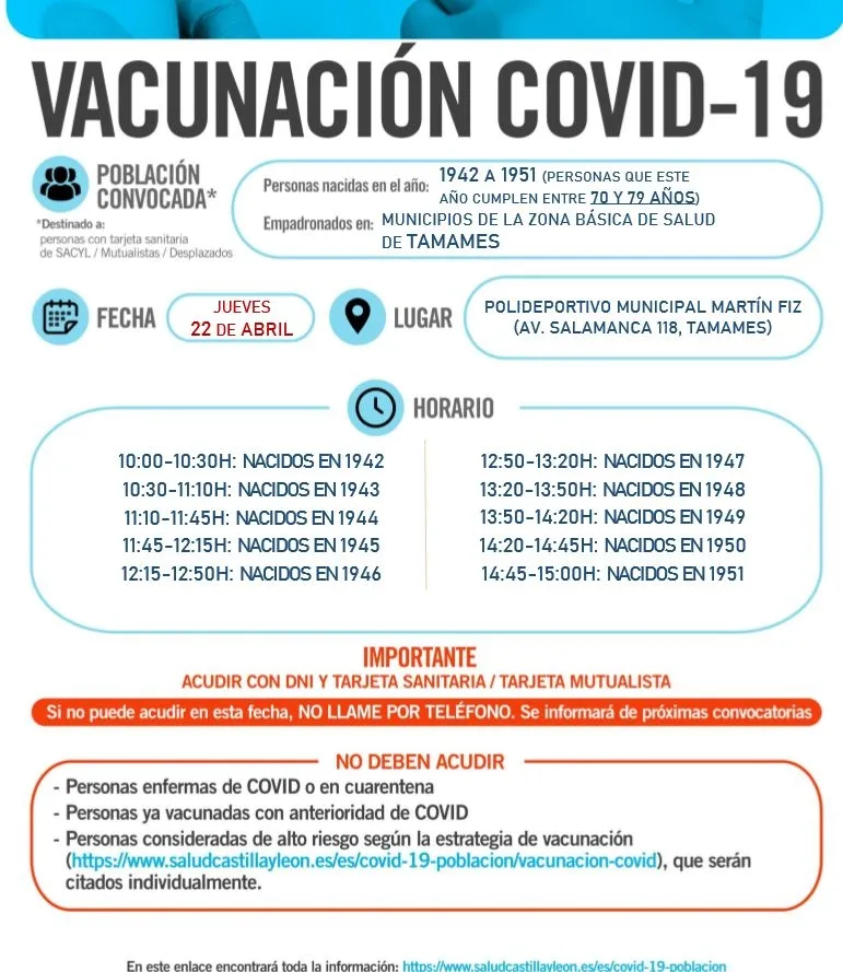Este jueves tendrá lugar en Tamames la vacunación frente a la Covid-19 de las personas nacidas entre los años 1942 y 1951. Es decir, están llamados a vacunarse las personas que tengan entre 70 y 79 años de la Zona Básica de Salud de Tamames.
