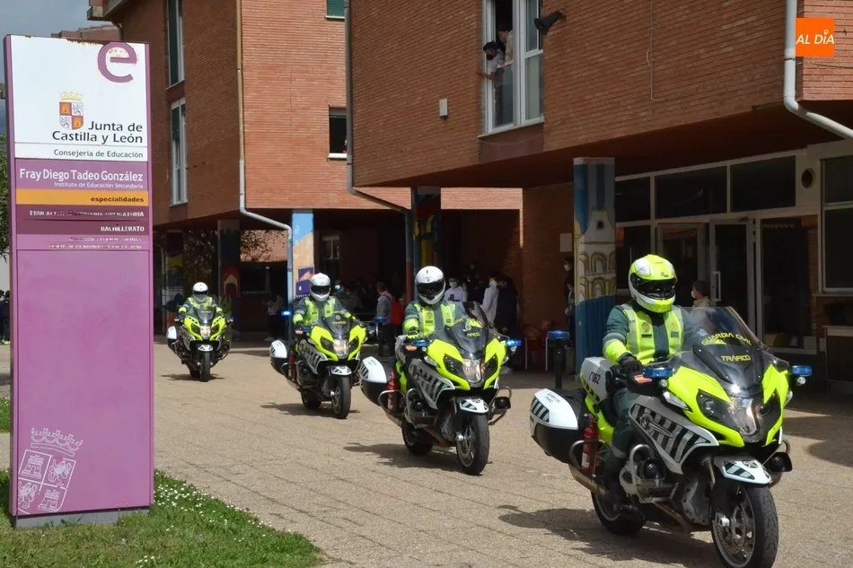 Una vez en el IES, todos los motoristas accedieron con sus monturas al centro, aparcando en las pistas deportivas para asistir a un sencillo pero ?merecidísimo homenaje a estos dos mirobrigenses que se han dejado la vida en servicio de la ciudadanía?, como apuntó Beatriz Jorge Carpio, teniente de alcalde del Ayuntamiento mirobrigense, quién también estuvo representado por los ediles Laura Vicente, Paola Martín Muñoz, Jorge Labajo y Carmen Lorenzo, así como por varios miembros de la Policía Local encabezados por su Jefe, Narciso Caridad.