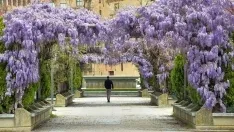 Bajo este rotundo arco de glicinias, de racimos florales tan hermosos, como desmesurados, un hombre camina protegido. No sabemos quién es.