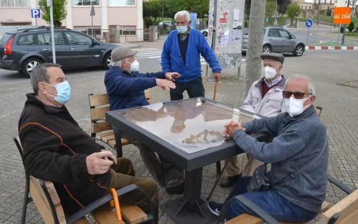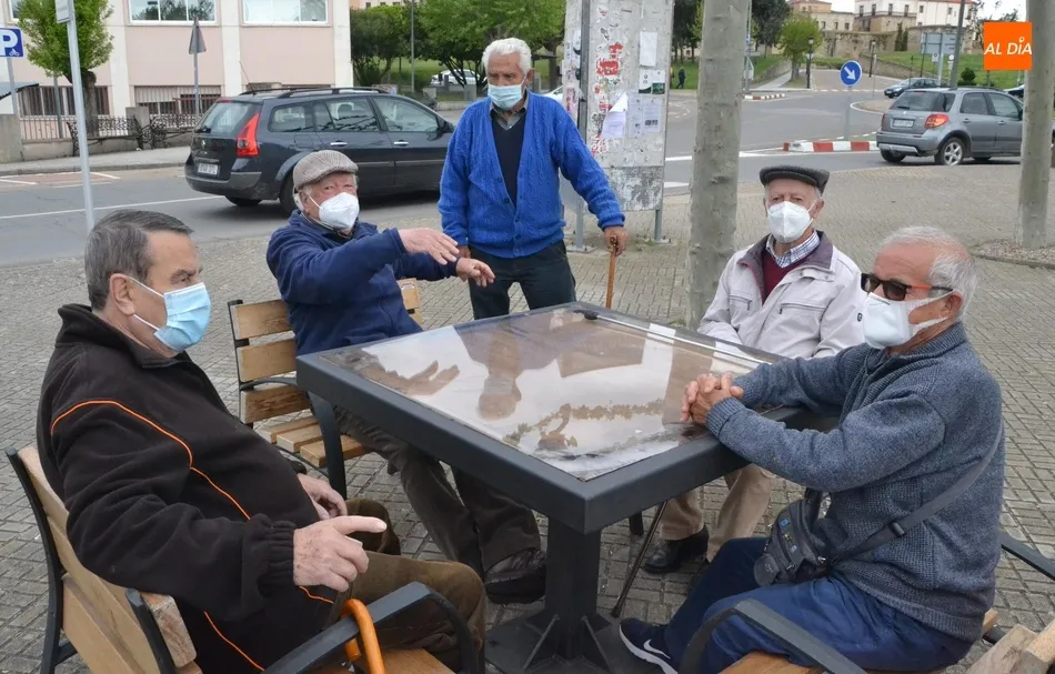 El 23 de abril es una de esas jornadas festivas que siempre acaban por resultar ?extrañas? al carecer en Ciudad Rodrigo de una gran referencia (aunque en los últimos años se ha consolidado la Feria del Libro en torno a este día). En esta ocasión, tenía como aliciente que era el punto de partida de un puente de tres días (para aquellos que no trabajen este sábado), lo que le dio un ritmo diferente, pudiéndose ver algunos turistas ?aunque no demasiados- y buena ocupación de las terrazas, aunque para otros como para los jubilados de la imagen el ritmo no cambió demasiado respecto a otros días precisamente por esa condición de estar ya retirados laboralmente.