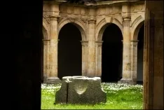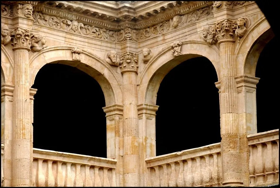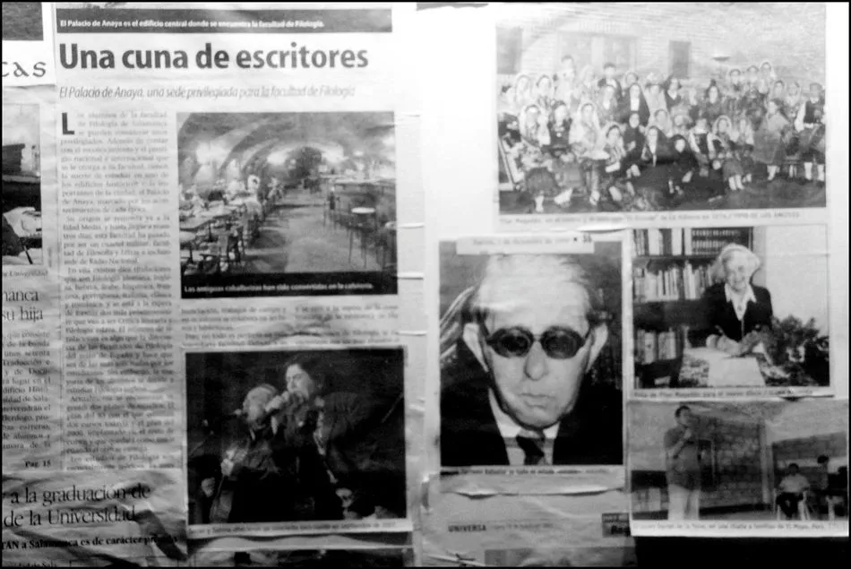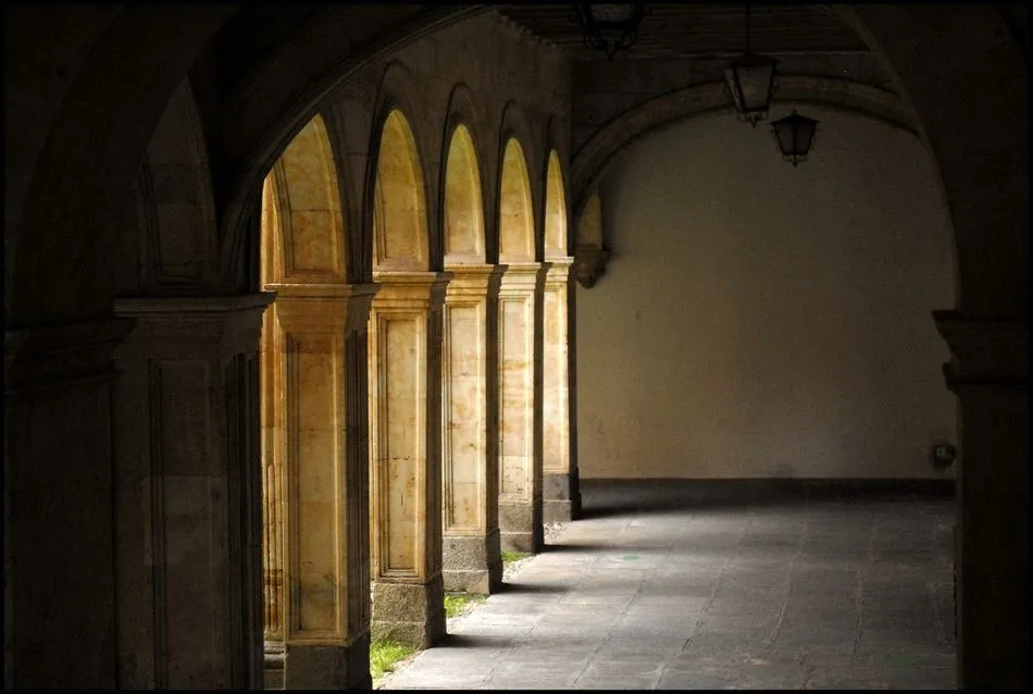 Cercana a su grandilocuencia, la Hospedería de Anaya es la joya diminuta de la dama neoclásica. Es barroca en el escudo de su entrada junto a la escalera, es renacentista en su claustro delicado terminado a medias, de ángeles sonrientes y delicadas columnas. La suya es la geometría del aula, la calidez de la piedra, la página revisada antes de entrar en los Departamentos de Lenguas Modernas que llenan sus muros seculares de libros y mesas donde se traducen las lenguas románicas. Hospedería es el rincón recoleto de los estudios antiguos de una Filosofía y Letras plenas de estudiantes que se sentaban en los claustros soleados, en las escaleras amables, en los asientos horadados por los grandes nombres. Y Amador Martín, atento al presente en su mirada que todo lo recorre, recuerda entre los muros historiados a los estudiantes más pobres que servían a los ricos y ocupaban estas paredes ahora revocadas de blanco y rematadas de angelotes renacentistas, traviesos querubines de la piedra estudiantil. Es el signo de los tiempos, el paso de los alumnos que permanecen entre sus muros años en los que habitan espacios de la docencia que se vuelven casa, refugio donde dejar el animal de carga que te acompañó en el viaje en los bajos de la Hospedería, en las amables caballerizas de ladrillo visto a las que descendemos por una estrecha escalera entre clase y clase de caña y vino en las mañanas, café en las tardes de estudio en la biblioteca.