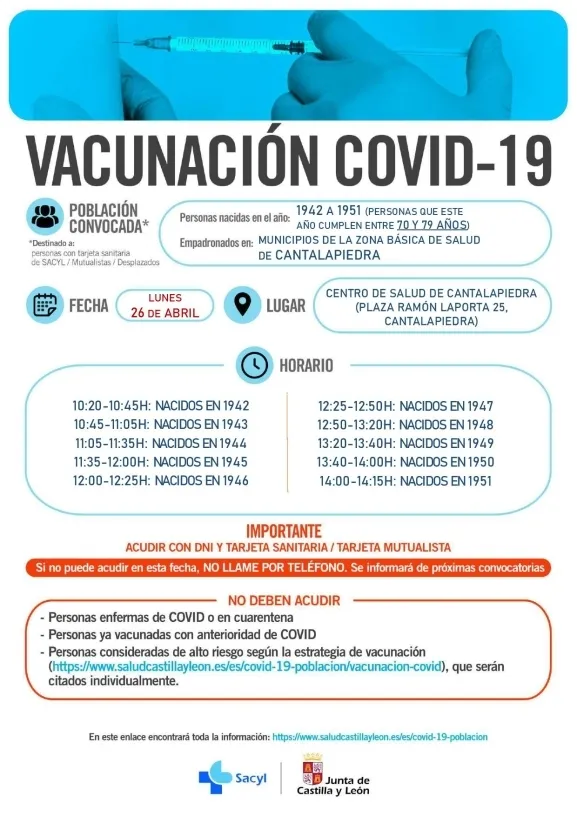 Las personas nacidas desde el año 1942 a 1951, empadronadas en municipios de la zona básica de salud de Cantalapiedra son llamadas a recibir la primera dosis de la vacuna Covid-19, este lunes, 26 de abril.
