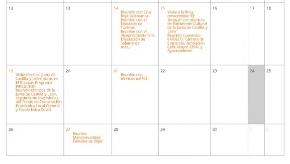 La Alcaldesa de Béjar trabajó la pasada semana dos mañanas de tres horas: la del lunes que comenzó a las 10 y finalizó a la una y la del miércoles que comenzó a las 9 y terminó a las 12. El lunes dedicó una hora a visitar las obras de El Bosque y después tuvo otra reunión de seguimiento de las inversiones del Fondo de Cooperación Económica Local General y Fondo Extra Covid. El miércoles se reunió con técnicos del ICE desde las 9 hasta las 12 de la mañana. Esa ha sido toda la agenda de trabajo semanal de Elena Martín, que se une a que la semana anterior también trabajó solo durante dos medias jornadas. De momento para la próxima está programada una reunión de 7 a 9 de la tarde del martes con la mancomunidad del embalse de Béjar. La agenda se puede ver en la web del Ayuntamiento.