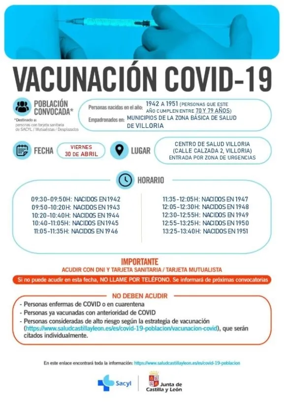 Las personas nacidas entre el año 1942 y el 1951 están llamadas a vacunarse en la zona básica de salud de Villoria. Los habitantes de estos municipios con entre 70 y 79 años podrán acudir este viernes en el horario que tienen asignado en los carteles al centro de salud de la zona para recibir su primera dosis contra el COVID-19.