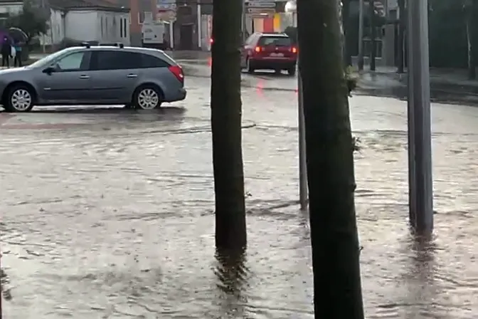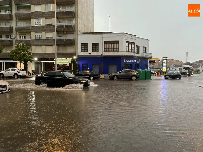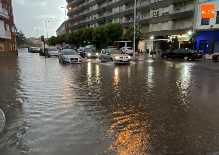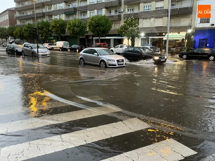 Un aguacero que comenzaba poco antes de las seis de la tarde, descargando una gran cantidad de lluvia, a la que acompañaron rachas de granizo, lo que provocaba inundaciones en diferentes puntos del casco urbano como la calle Cervantes, Avenida de Salamanca, Paseo de la Est