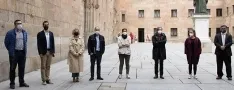 Los trabajadores del Área de Comunicación y de la Unidad de Protocolo de la Universidad de Salamanca, acompañados por los vicerrectores de Estudiantes y Sostenibilidad, Celia Aramburu, y Relaciones Internacionales, Efrem Yildiz, se han sumado en la puerta del Rectorado al minuto de silencio convocado en su recuerdo.