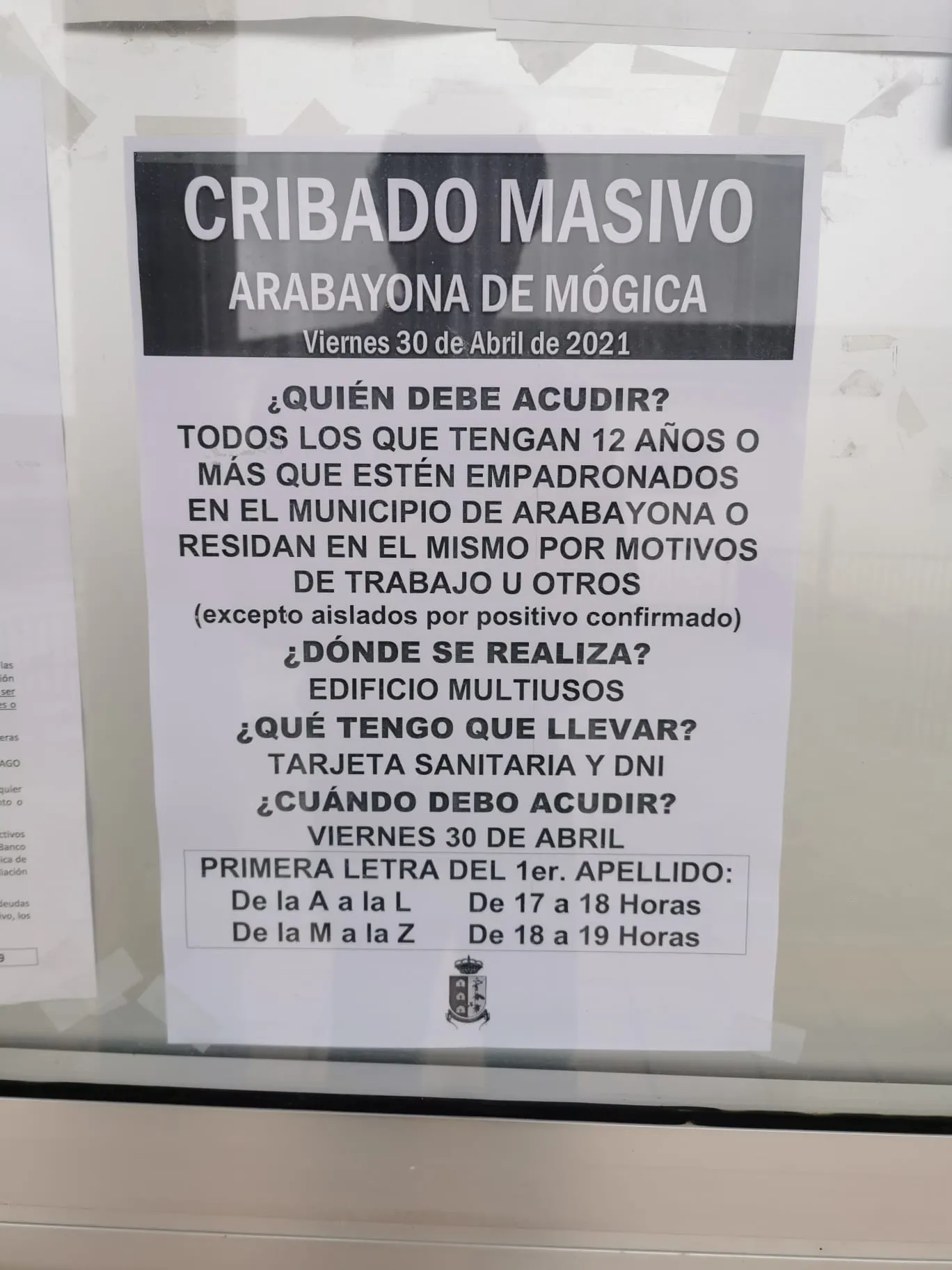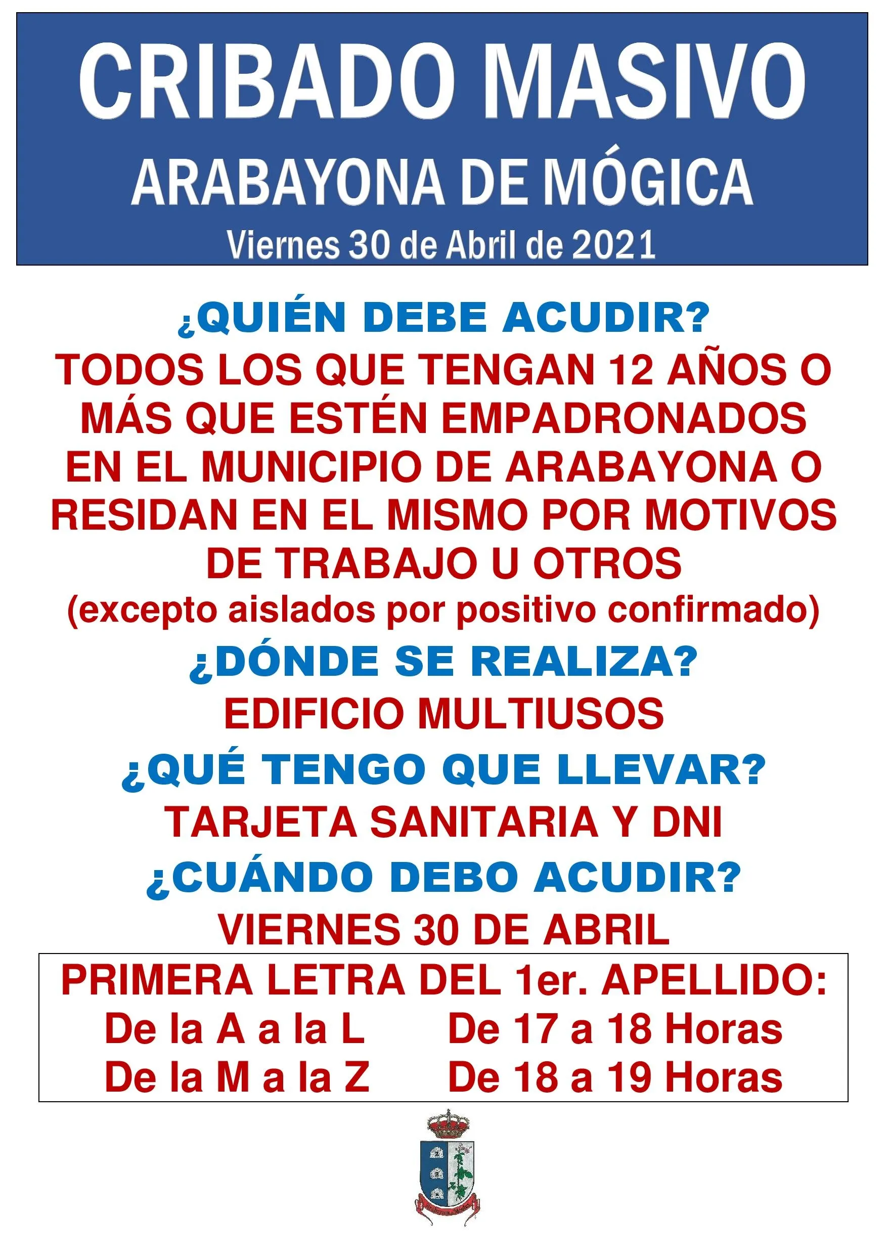 El Ayuntamiento de Arabayona ha publicado hoy un cartel informativo para informar a sus vecinos de la necesidad de acudir al cribado masivo que tendrá lugar el viernes. Todos los habitantes con 12 años de edad o más han de acudir al Multiusos Agustín Salgado. Están llamadas las personas que residen en la localidad. Las pruebas se realizarán en dos grupos, el primero de 17 a 18 horas y el segundo, de 18 a 19 horas.