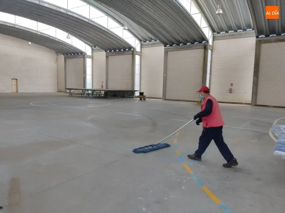 Esta mañana un empleado municipal adecentaba el multiusos, mientras una máquina de la diputación procedía a la desinfección de las calles, tarea que realizan semanalmente, en palabras de Aquilino de Dios, alcalde. Los bares del pueblo también están cerrados.