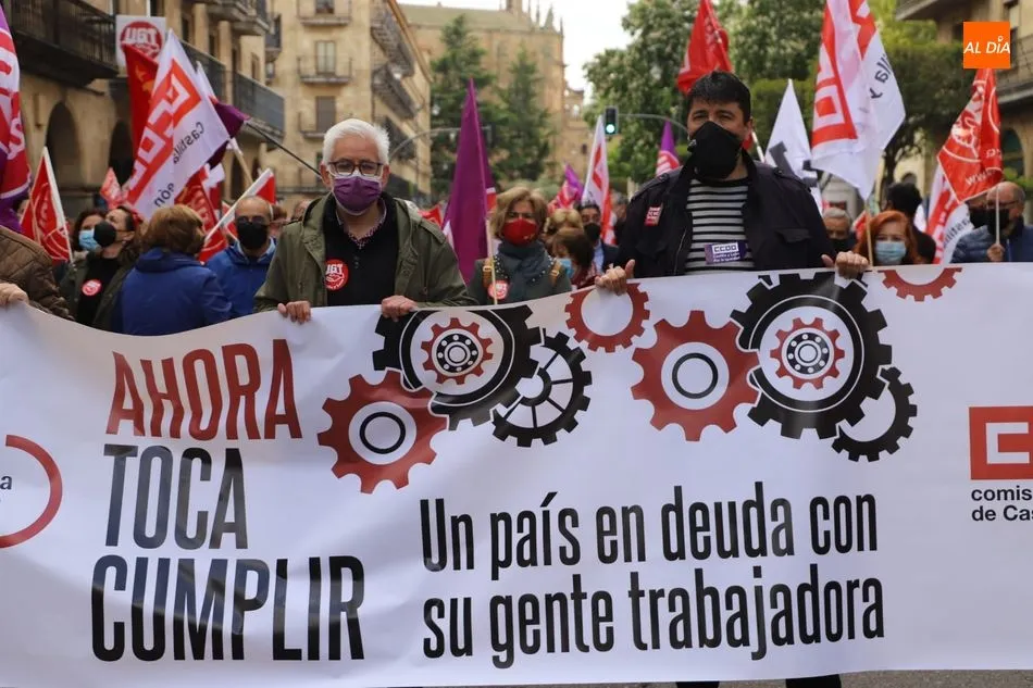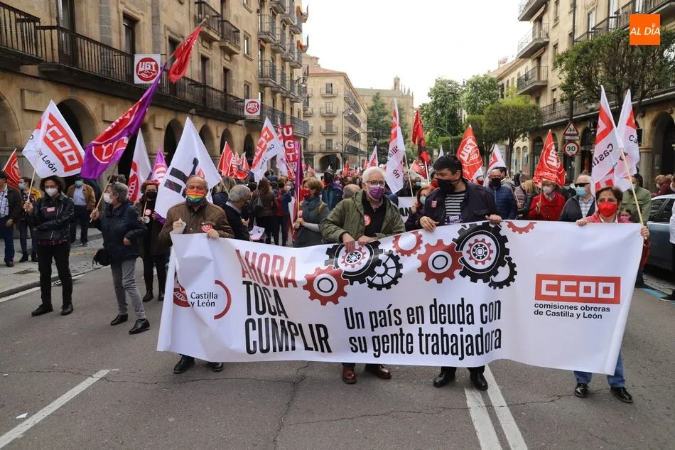 La tradicional marcha del 1 de mayo, se ha celebrado de nuevo en Salamanca con la participación de los sindicatos CCOO y UGT. En esta ocasión han marchado con el lema ?ahora toca cumplir. Un país en deuda con su gente trabajadora?. La comitiva ha partido a mediodía desde la Gran Vía, donde están ambas sedes sindicales hacia la Plaza Mayor por las calles San Justo y San Pablo.