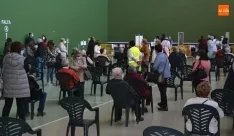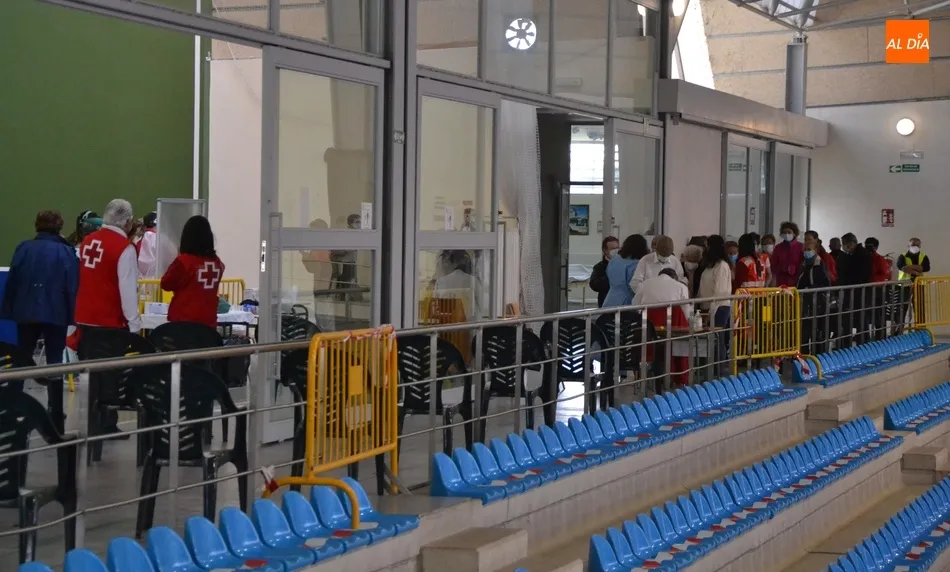 Como se puede ver en las imágenes, una vez más se ha establecido un circuito de vallas a las puertas del Pabellón para que los futuros vacunados vayan accediendo ordenadamente al interior, donde también se sigue el ya habitual circuito en dirección al frontón, por donde hay establecidas varias líneas de vacunación (en el momento de tomarse las imágenes estaban funcionando tres), de la mano de personal sanitario del Sacyl.