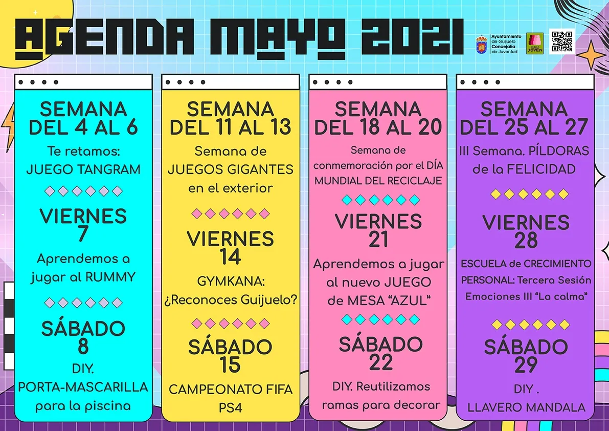 El día mundial del reciclaje, juegos al aire libre, juegos de mesa y tercera sesión de las píldoras de la felicidad son algunas de las citas que los jóvenes podrán compartir este mes de mayo en Guijuelo Joven.