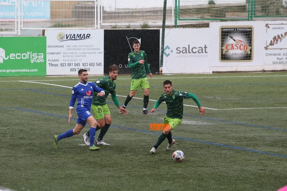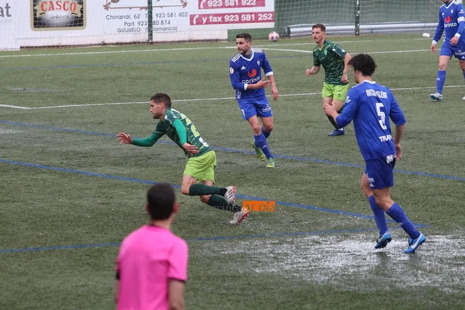 El CD Guijuelo, libre ya de preocupaciones, no tuvo problema esta tarde para vencer ante el único equipo que tenía por debajo en la clasificación. Un Covadonga que llegó tan descendido como los chacineros y que acabó derrotado por 3 a 1 en un partido pasado por agua y sin relevancia para el resto de la tabla.