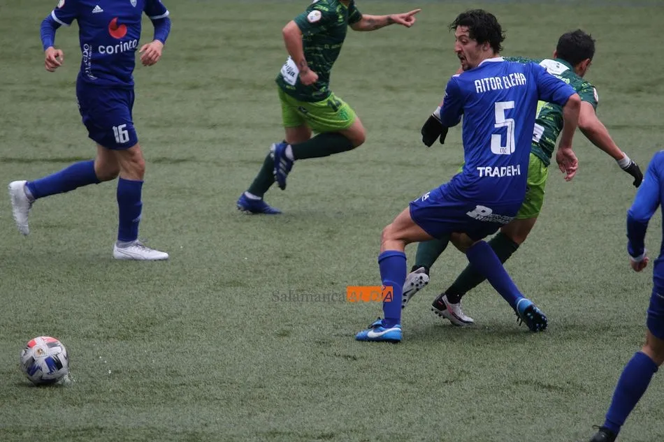 El Covadonga llegó a empatar, fruto de un penalty pitado tras una intervención de Sarkauskas, el portero local. Javi Martón se encargó del lanzamiento y empató el encuentro en el minuto 14. Hubo unos minutos de igualdad entonces, con el propio Martón protagonizando otro disparo peligroso. Pero las dudas se disiparon pronto con el segundo tanto del Guijuelo, este segundo en el minuto 26. Manu Molina marcó el mejor tanto del encuentro batiendo con un buen remate a Escobar. Prácticamente fue el final del encuentro. Con una intensa lluvia y los dos equipos con los papeles repartidos, la función no ofreció mucho más espectáculo.