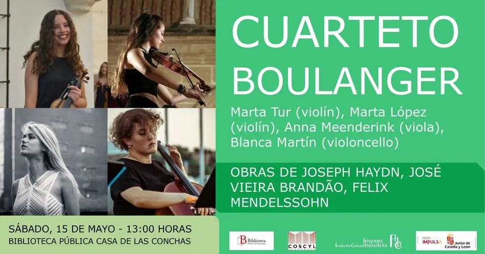 Como cuarto concierto del ciclo MUSICALIA que organiza la Fundación Cultural Hispano-Brasileña con la colaboración del COSCYL tendremos al Cuerteto Boulanger formado por Marta Tur (violín), Marta López (violín), Anna Meenderink (viola) y Blanca Martín (violoncello). Interpretarán obras de Haydn, José Vieira Brandão y Felix Mendelssohn. Podremos disfrutar con su música el sábado 15 de mayo a las 13:00 horas en la Biblioteca de la Casa de las Conchas. La entrada será libre hasta completar aforo.