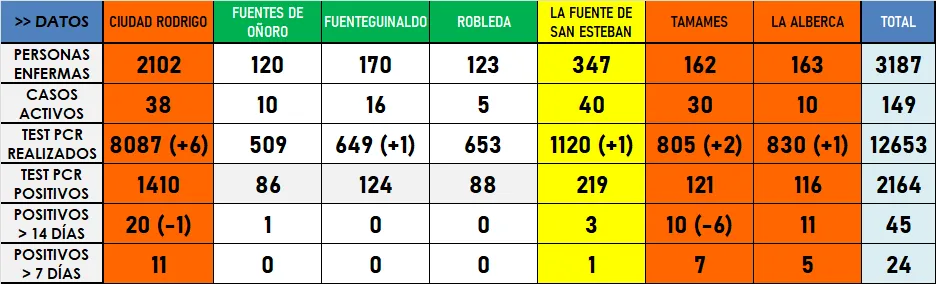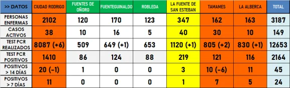Siguiendo la tónica general de toda la provincia (donde sólo se contabilizan 7 positivos más), la actualización de la jornada del lunes de los datos de enfermos de coronavirus por parte de la Consejería de Sanidad de la Junta de Castilla y León apenas trae novedades para los 54 municipios que integran la comarca de Ciudad Rodrigo, y los escasos que hay son claramente favorables.