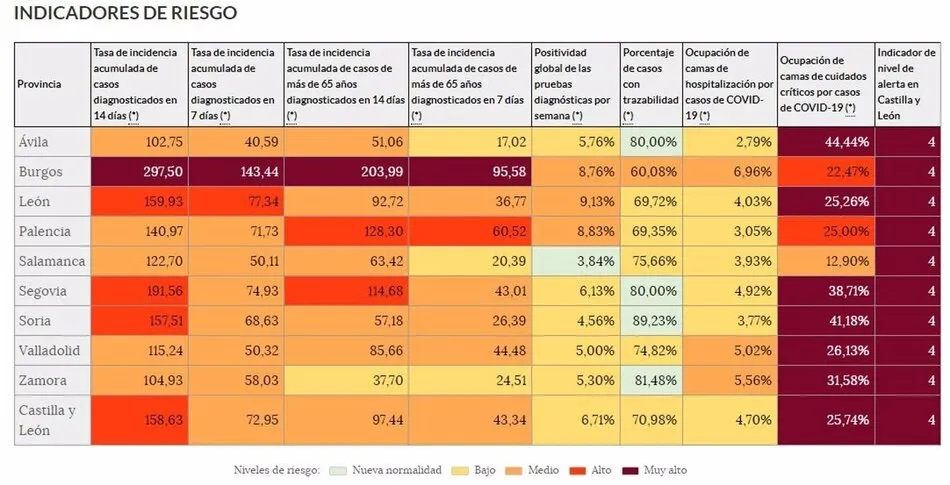 La incidencia acumulada a 14 días en el conjunto de la Comunidad se sitúa en 159 casos por 100.000, con la provincia de Burgos a la cabeza, con 297 casos por 100.000 habitantes. Es la única de las nueve en situación de riesgo 'muy alto' -establecida en el 'semáforo COVID' a partir de una tasa de 250-.