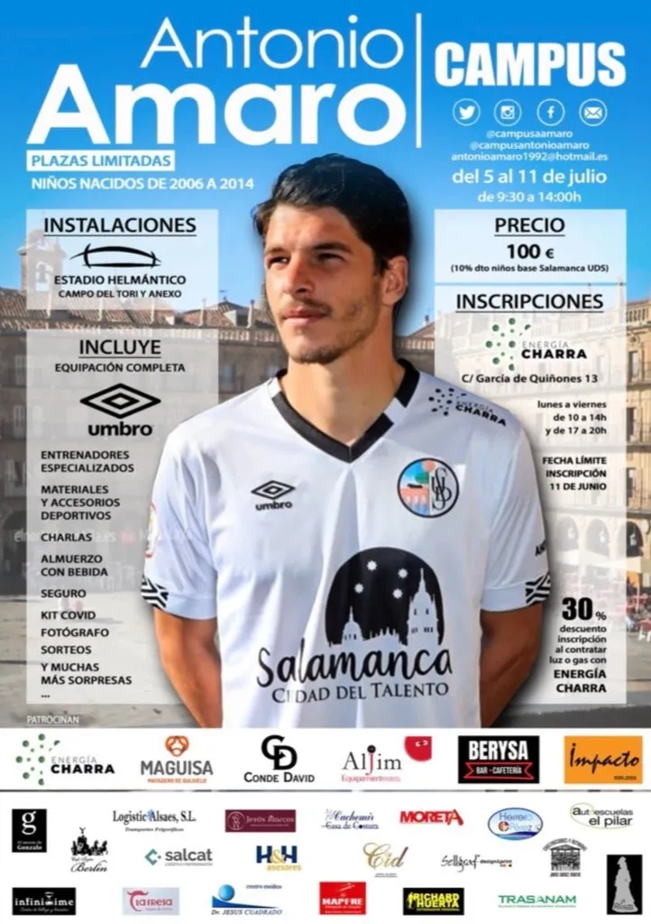 Antonio Amaro lanzó su Campus para este verano en el Estadio Helmántico. Así, el capitán del Salamanca UDS decidió apostar por formar a los más jóvenes del 5 al 11 de julio en el Tori y el Anexo. Dicha actividad estará dirigida a aquellos niños nacidos entre 2006 y 2014.