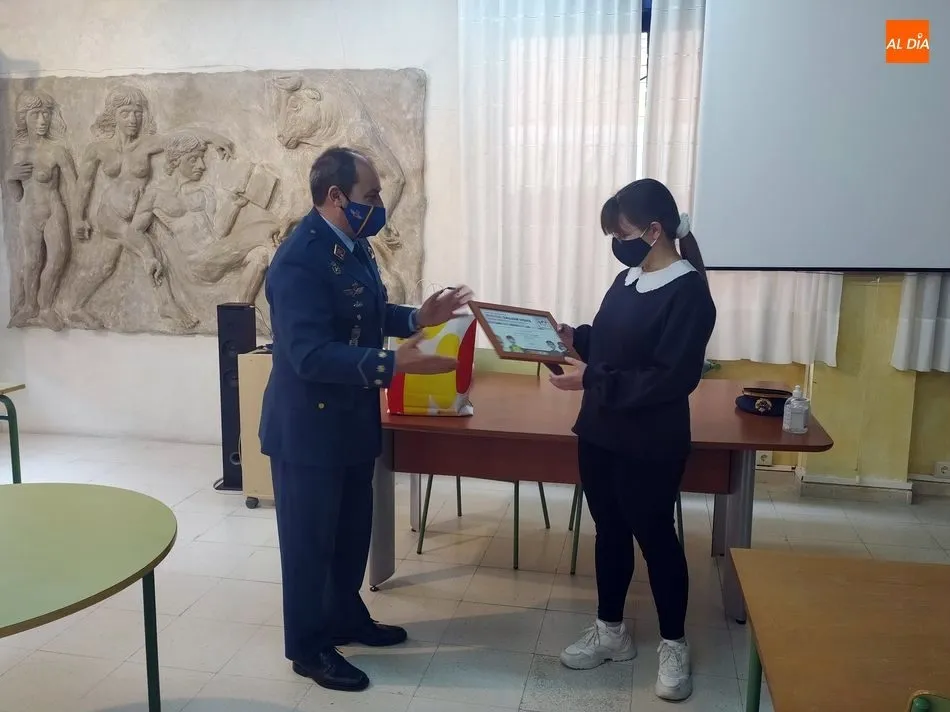 Tras la entrega de un diploma a la ganadora de esta edición de ?Carta a un militar español?, el coronel Emilio García hacía entrega a la directora del IES de un diploma que acredita a este centro educativo como ganador del concurso, reconocimiento que recibió la directora del centro, Raquel Rodríguez.