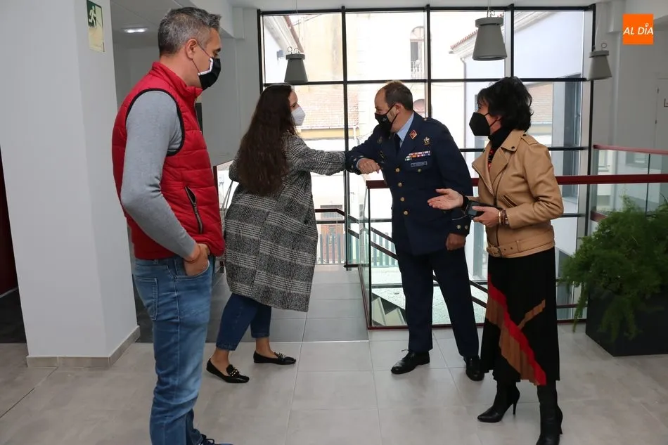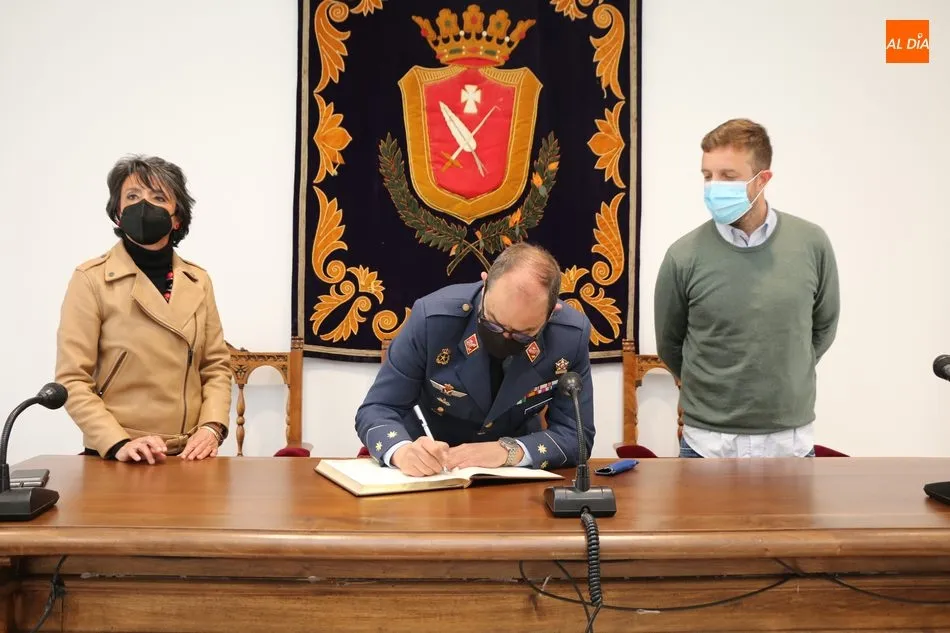 Una vez finalizado el acto en el IES Ramos del Manzano, el subdelegado de Defensa de Salamanca realizaba una visita institucional al Ayuntamiento de Vitigudino y mantenía un breve encuentro con la alcaldesa del Municipio, Luisa de Paz Palacios, un acto que comenzaría con la firma del coronel Emilio García Herrera en el libro de honor del Ayuntamiento.