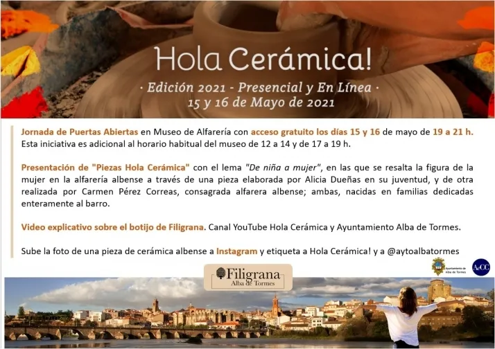 ?Desde el área de cultura nos hemos querido sumar a esta iniciativa de la Asociación Española de las Ciudades de la Cerámica, de que Alba de Tormes forma parte, para seguir dando visibilidad a la tradición alfarera de Alba de Tormes y a su filigrana, siempre siguiendo todas las medidas y protocolos de seguridad establecidos para una visita segura?, asegura Concepción Miguélez, alcaldesa de Alba de Tormes quien añadió que ?no debemos olvidar que la pandemia aún no ha finalizado y debemos ser rigurosos con todas las medidas de seguridad para poder ir restableciendo la normalidad y seguir luchando contra la COVID-19?.
