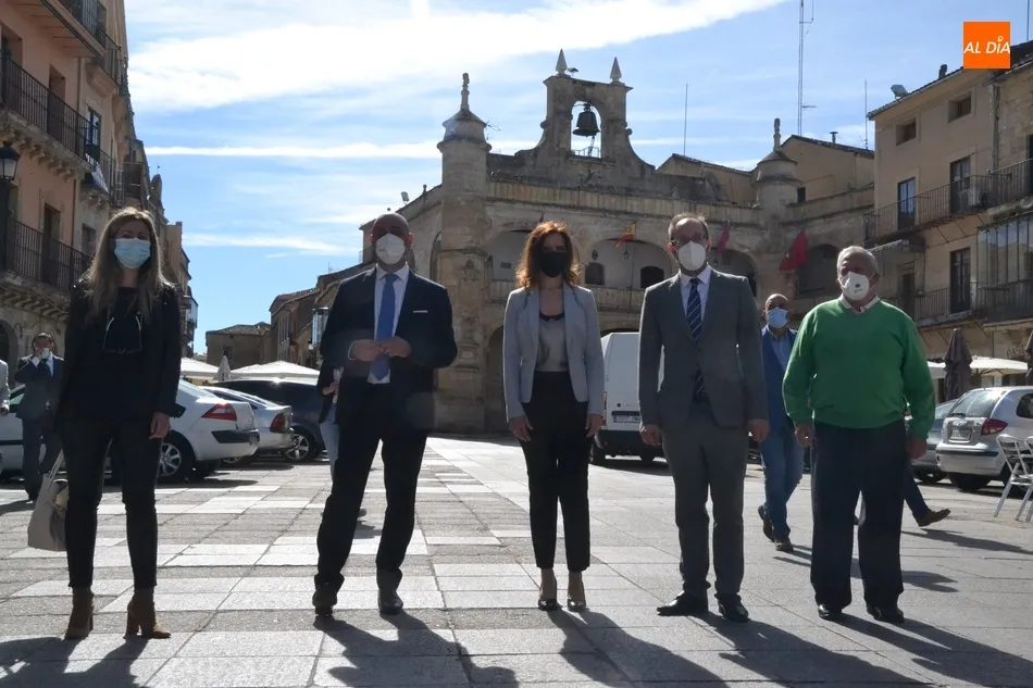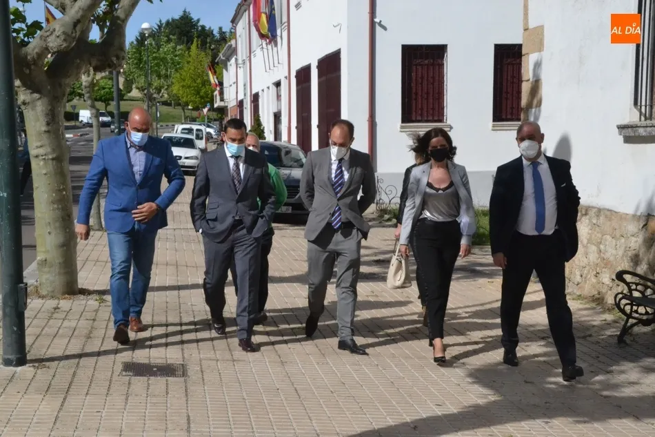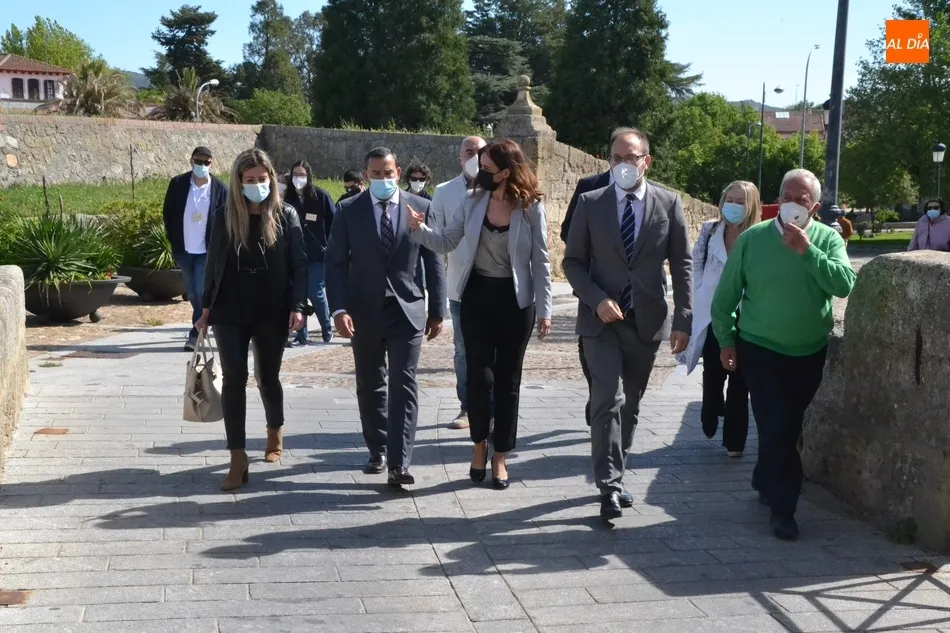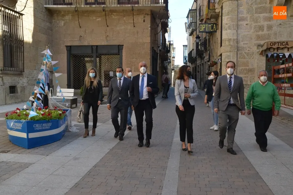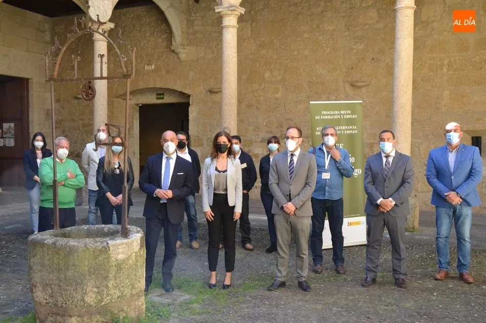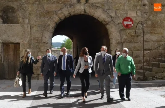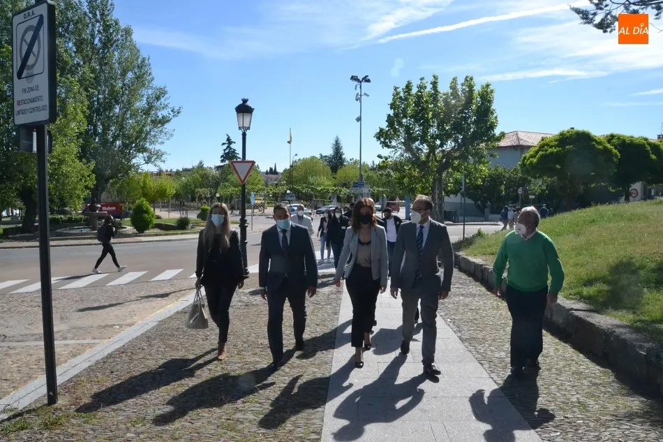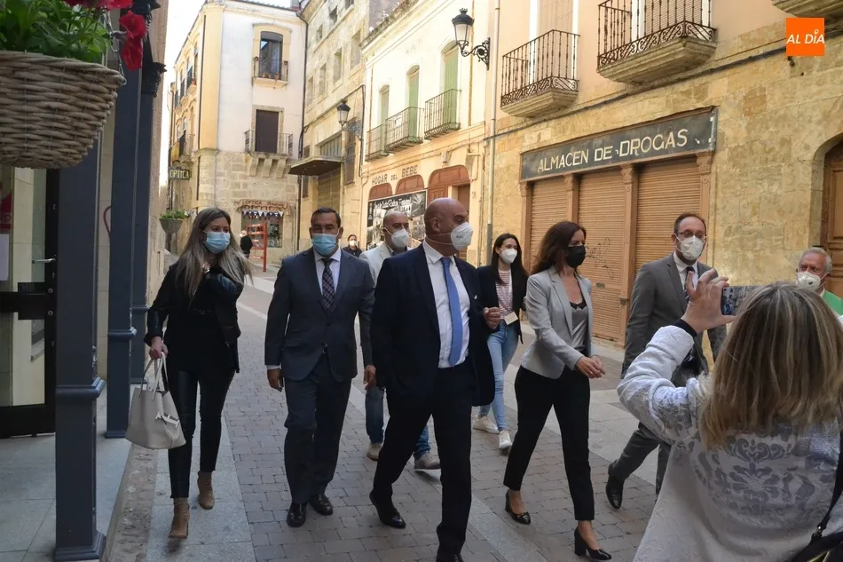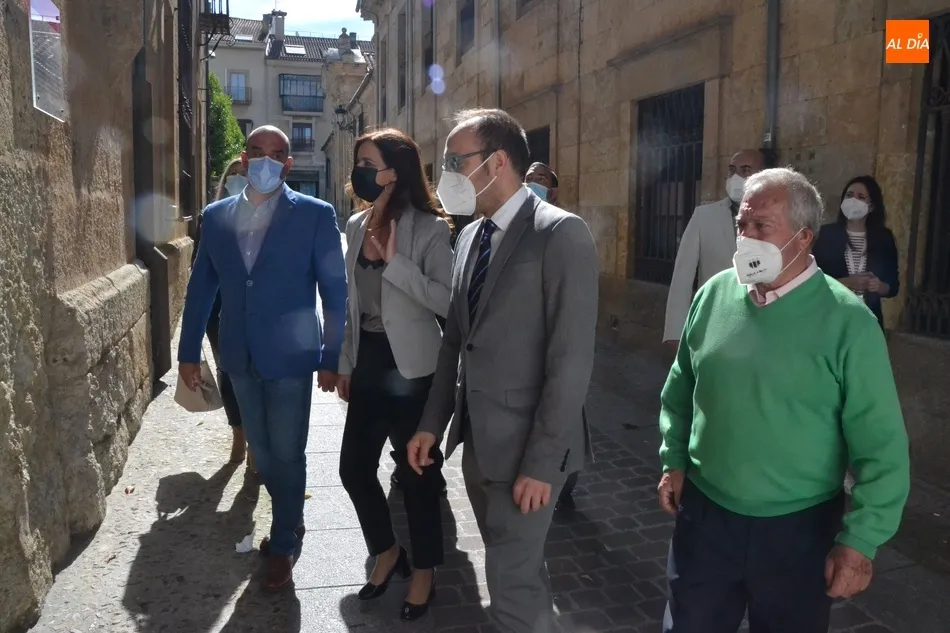 Ana Carlota Amigo, que estuvo acompañada por el delegado territorial de la Junta en Salamanca, Eloy Ruiz, y por el gerente del Ecyl en Salamanca, Juan Carlos Sánchez, junto a varios miembros del Equipo de Gobierno del Ayuntamiento encabezados por el alcalde Marcos Iglesias, se dirigieron a continuación a pie (pasando por la calle Madrid, donde la consejera también quiso una foto con el popular ?Almacén de Drogas?) hasta el Palacio de Los Águila, donde los alumnos ?Patrimonio Ciudad Rodrigo? realizan prácticas.