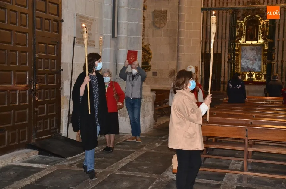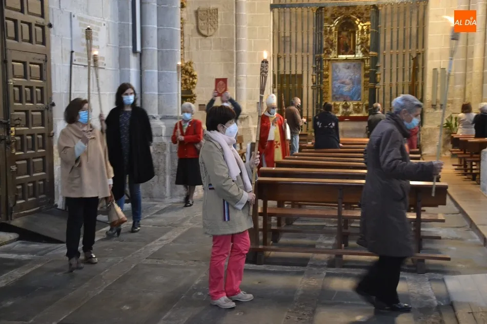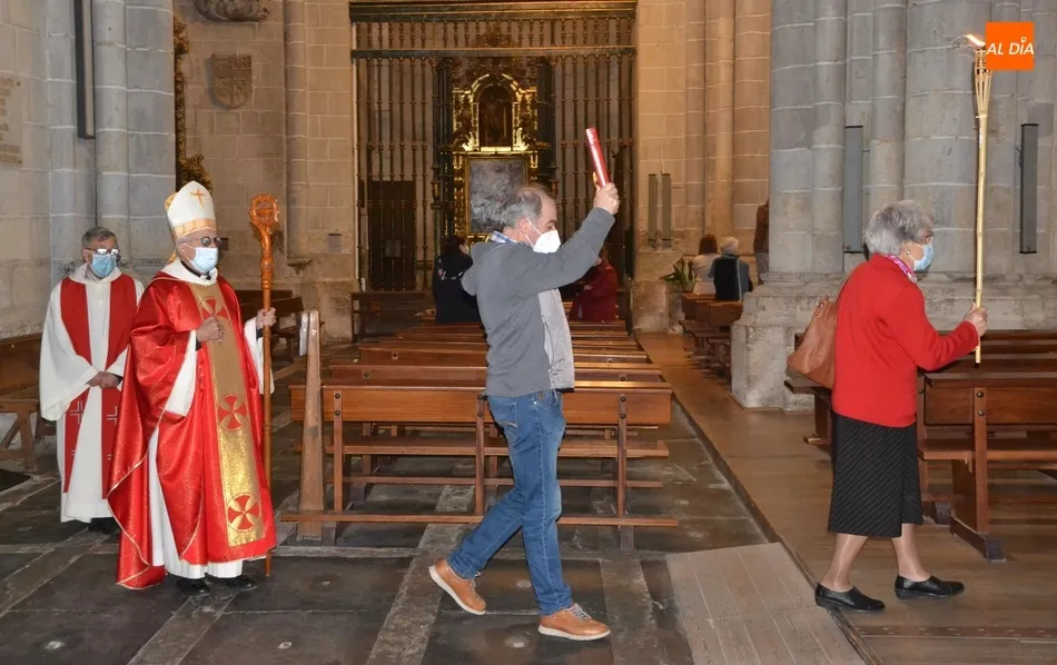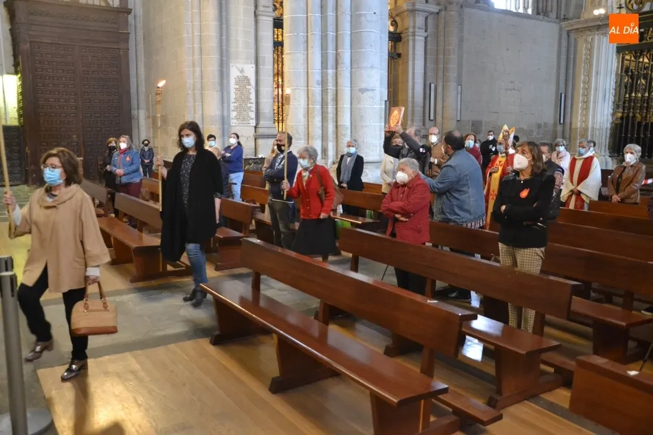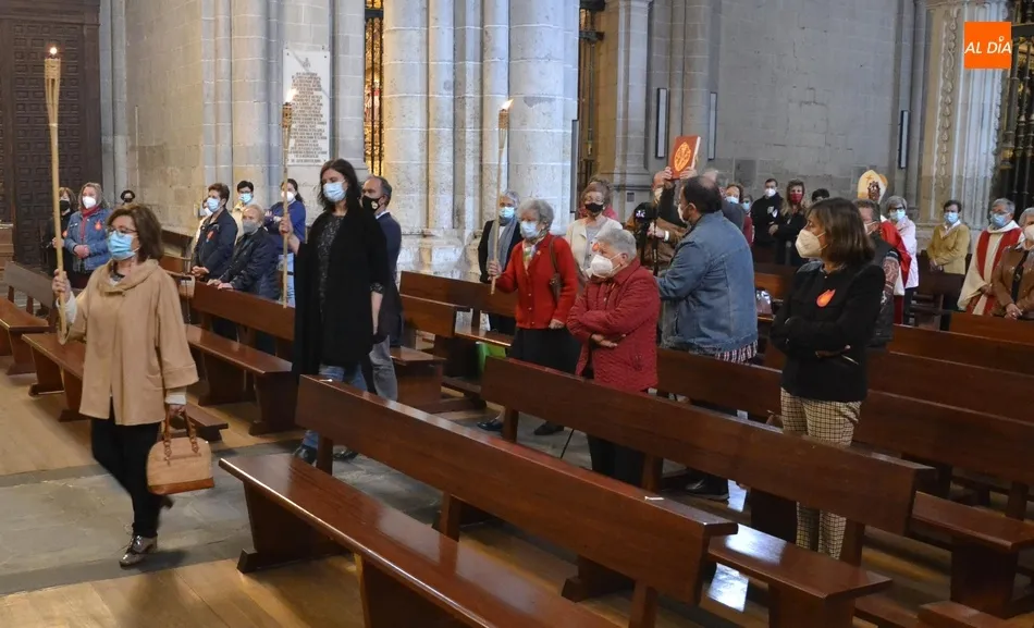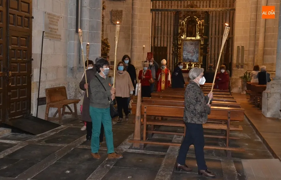 Tras un tiempo de descanso, se pusieron en común las conclusiones del trabajo por grupos, dirigiéndose posteriormente todos los participantes a la Catedral de Santa María, para asistir a una solemne eucaristía presidida por el Administrador Apostólico de la Diócesis, Jesús García Burillo, con la compañía del resto de sacerdotes asistentes al Encuentro. Como se puede ver en las imágenes, la celebración litúrgica comenzó con una procesión de antorchas en dirección al altar.