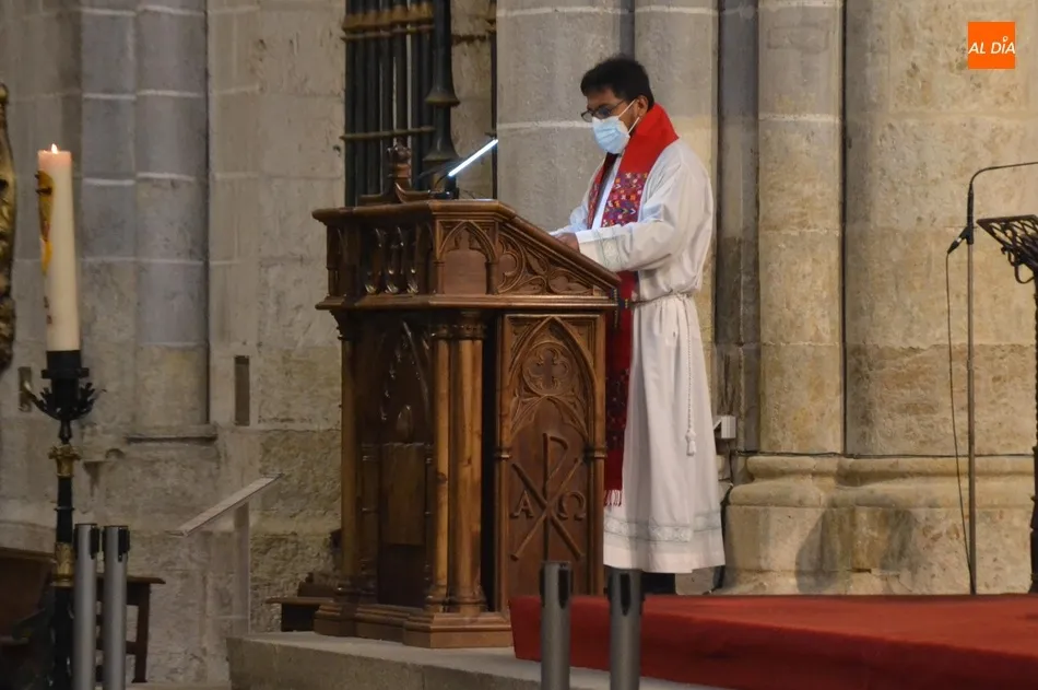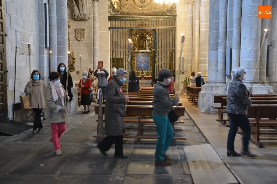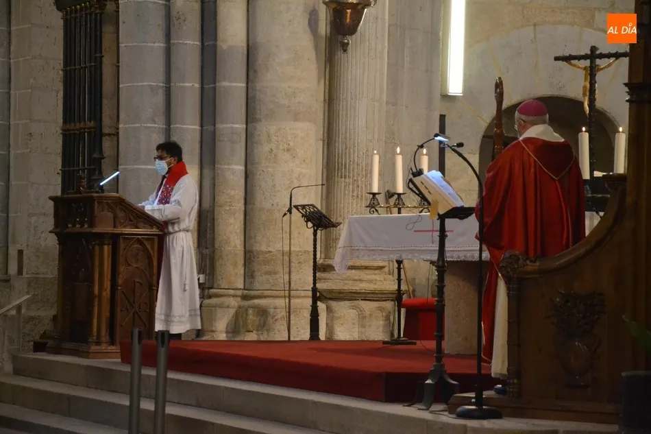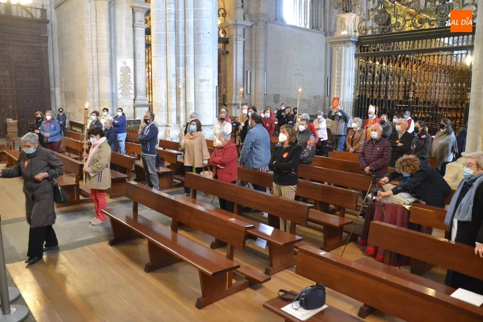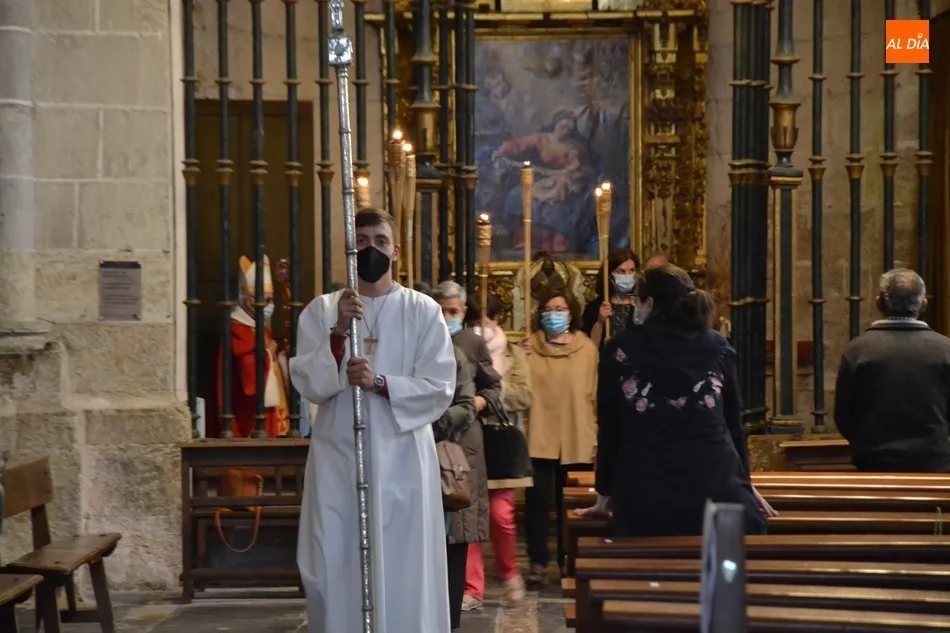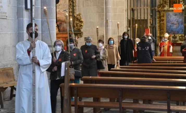 Tras un tiempo de descanso, se pusieron en común las conclusiones del trabajo por grupos, dirigiéndose posteriormente todos los participantes a la Catedral de Santa María, para asistir a una solemne eucaristía presidida por el Administrador Apostólico de la Diócesis, Jesús García Burillo, con la compañía del resto de sacerdotes asistentes al Encuentro. Como se puede ver en las imágenes, la celebración litúrgica comenzó con una procesión de antorchas en dirección al altar.