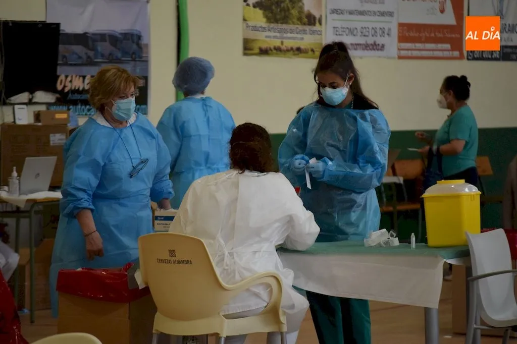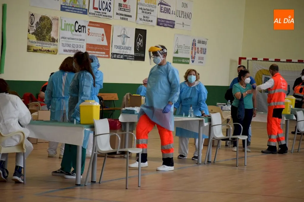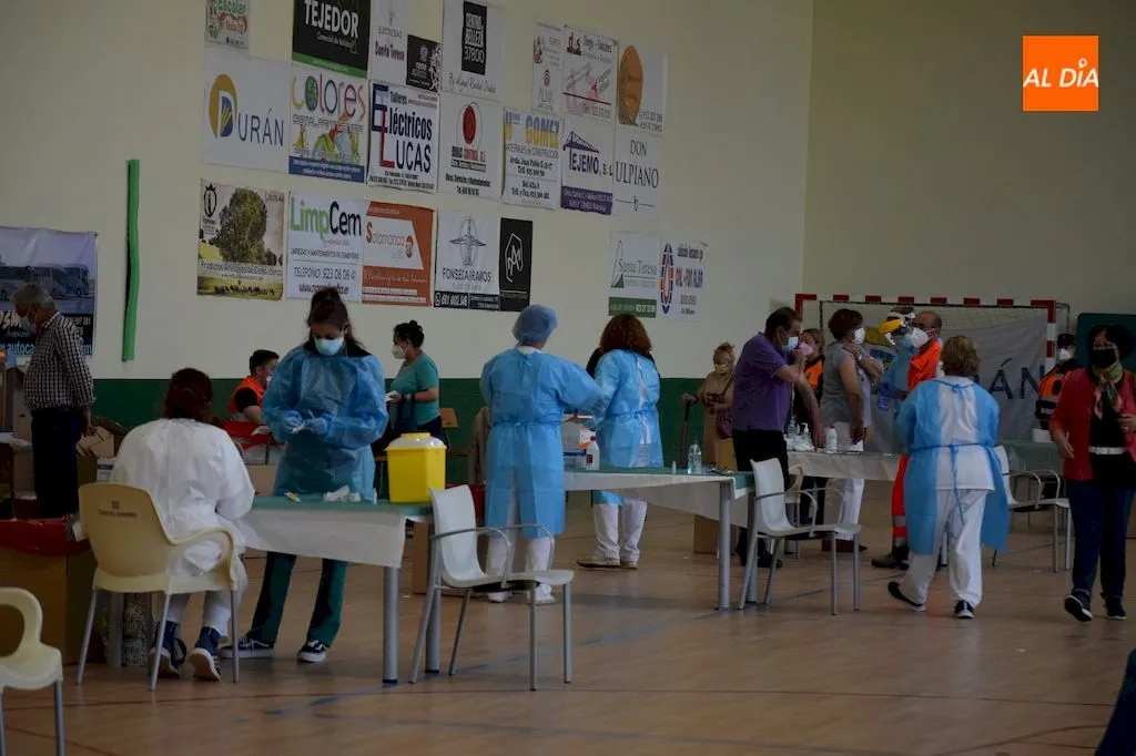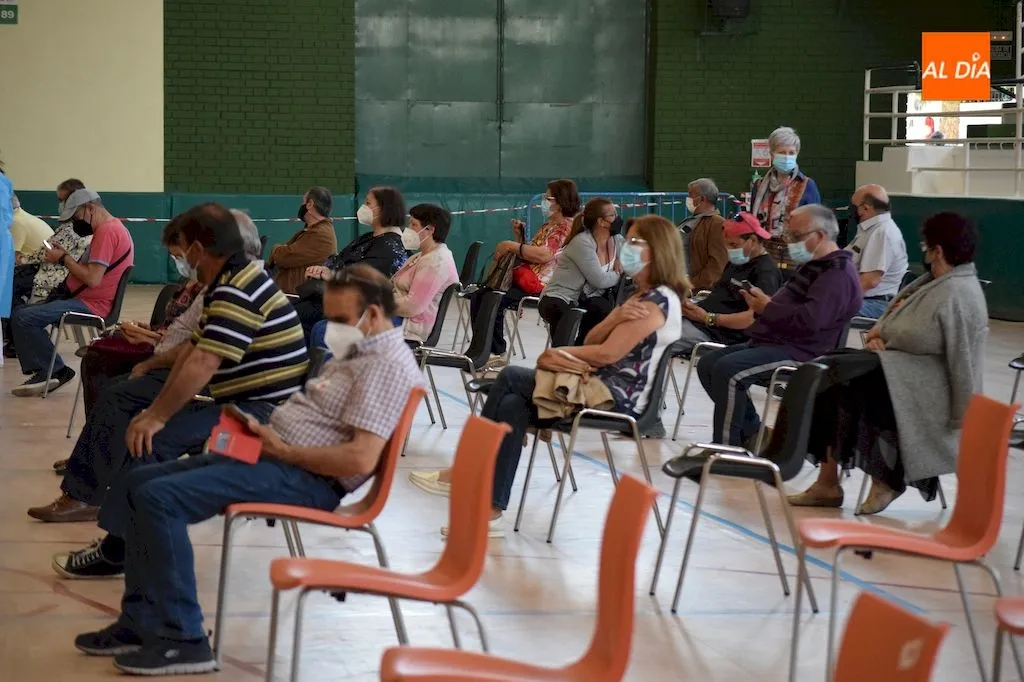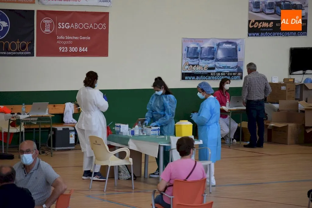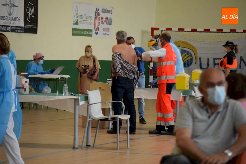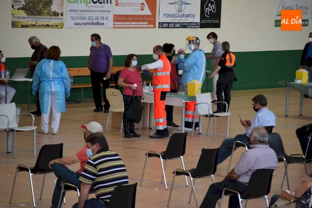Las personas nacidas entre 1952 y 1955 pertenecientes a la zona básica de salud de Alba de Tormes han recibido este miércoles la segunda dosis de la vacuna contra el coronavirus en el pabellón municipal de Alba de Tormes.