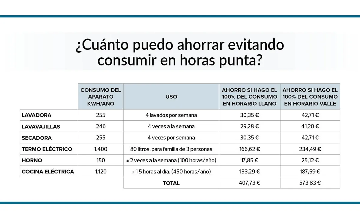 Si se consigue evitar el horario punta (de 10 a 14 horas y de 18 a 22 horas en laborables), cuando se usa la lavadora, el lavavajillas y la secadora es posible ahorrar en torno a unos 30 ? al año por cada uno de estos aparatos sin necesidad de usarlos de noche, solo aprovechando el horario llano los días laborables. Programando por la noche estos electrodomésticos (o los fines de semana en horario valle, el ahorro podrá alcanzar los 130 ? entre los 3 electrodomésticos.