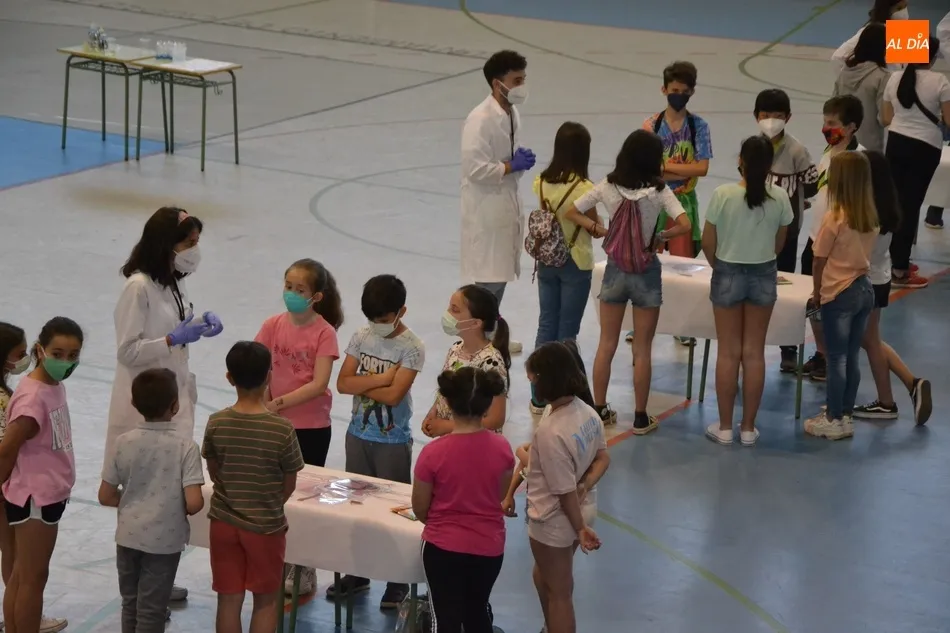 Enrique Madruga, junto a sus compañeros Vanesa Nozal, Elena Caballero, Marcos Morales e Inés Inarejos (un grupo que ?nos gusta la divulgación y transmitir el conocimiento a la sociedad?, según apuntaron), recibieron en el Pabellón Eladio Jiménez a un total de 40 niños mirobrigenses (el cupo máximo posible, que se cubrió en 24 horas cuando se anunció la actividad), que divididos en grupos de 10 afrontaron un total de 8 pruebas en torno a los medicamentos.