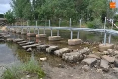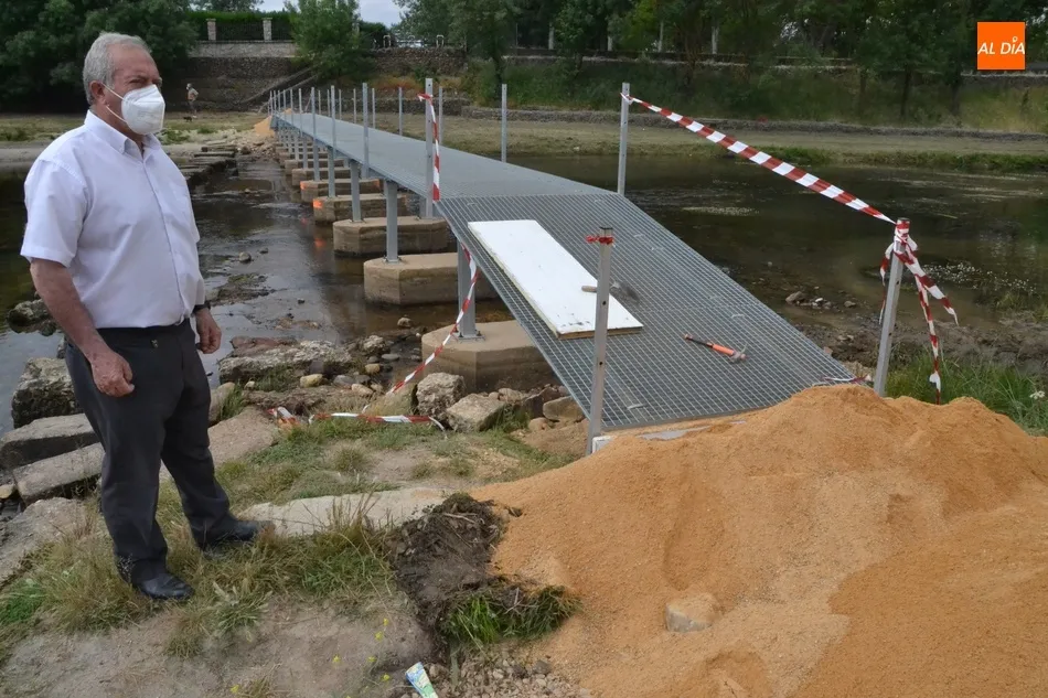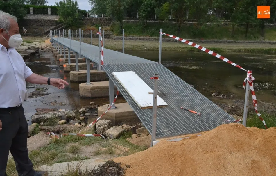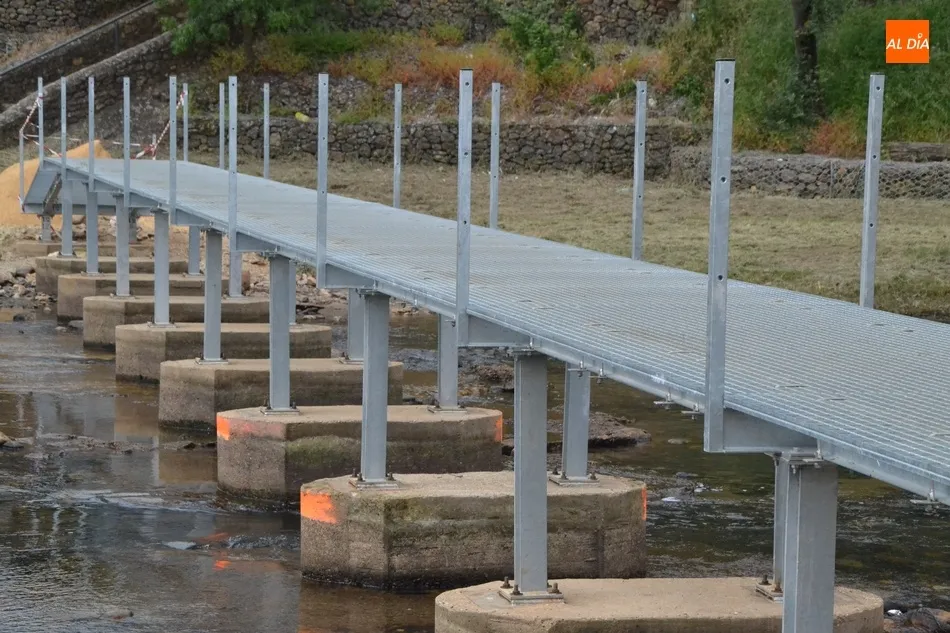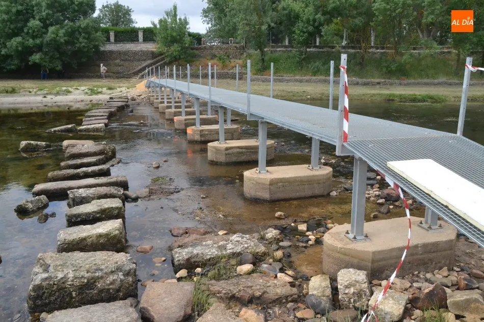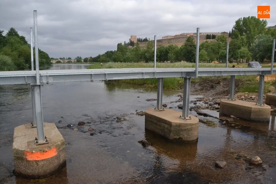 Siguiendo el plazo autorizado por la Confederación Hidrográfica del Duero para que esté instalada (del 1 de junio al 30 de septiembre de cada año), el Ayuntamiento de Ciudad Rodrigo inició en la mañana del lunes las tareas de montaje de la pasarela, operación que quedó culminada durante la mañana del martes. Como conocen los mirobrigenses, el montaje de la estructura se realiza sobre la decena de zapatas que han quedado de forma permanente en el cauce en las inmediaciones de los pontones.