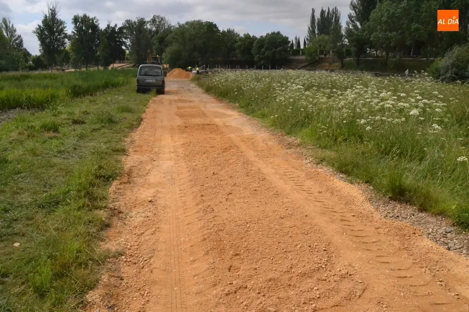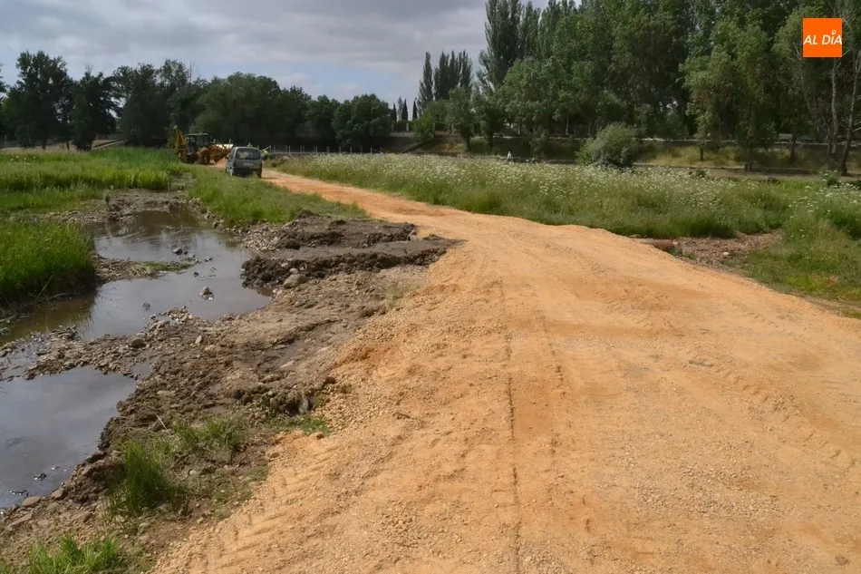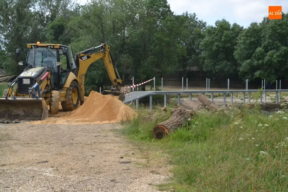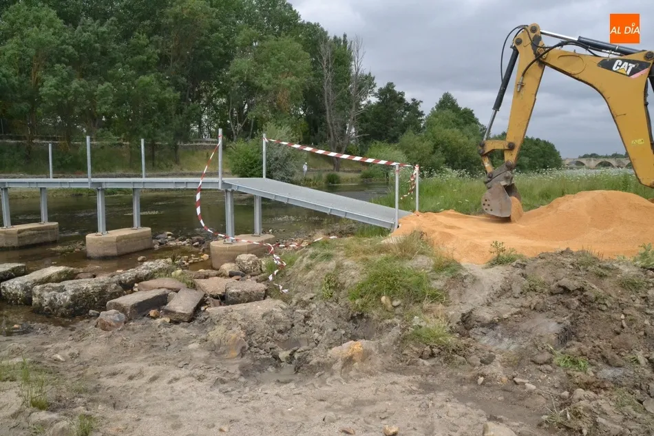 Junto a la pasarela en sí, en la mañana del martes se estuvo trabajando en la preparación de los accesos a la misma, para que no haya ningún ?escalón? por ninguno de los dos laterales. Asimismo, se ha echado tierra en el camino que lleva desde la pasarela a la isla de El Picón propiamente dicha, que había estado intransitable hasta hace unos días al estar cubierto por el agua, al bajar el río más crecido (desde el lunes, precisamente para facilitar el montaje de la pasarela, se ha pasado de un caudal de cerca de 7 metros cúbicos por segundo a sólo 1,5).
