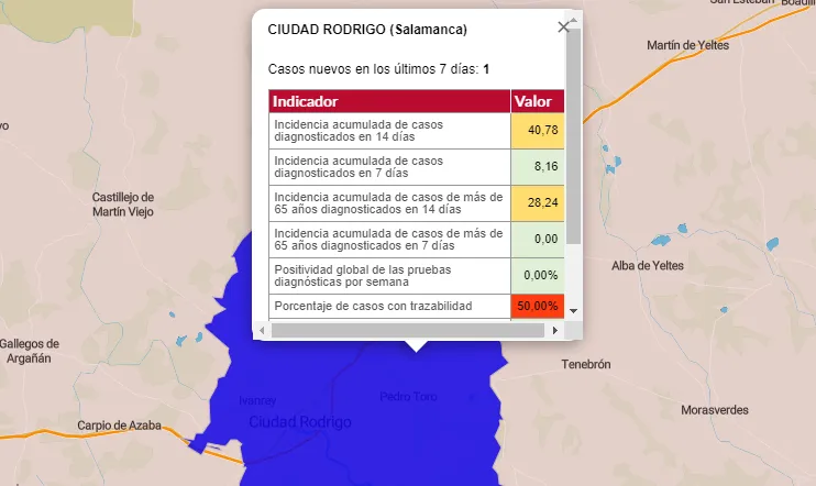 Ese positivo en Ciudad Rodrigo es el primero en esta localidad desde el 23 de mayo, provocando que su dato de incidencia semanal deje de ser ?0? (situación en la que había estado el domingo y el lunes) y suba a 8 casos por cada 100.000 habitantes. Mientras tanto, la incidencia quincenal repite en 40 casos por cada 100.000 habitantes (lo que equivale en números absolutos a 5 positivos).