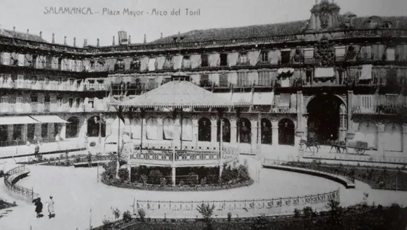 La plaza Mayor de Salamanca ha tenido muchas configuraciones. En esta fotografía de finales de 1921 o principios de 1922 se ve el templete con faldones y el comienzo de los círculos que darán lugar a los pequeños estanques en los cuatro jardines.