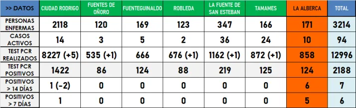En concreto, en lo que respecta a los datos de la Zona Básica de Ciudad Rodrigo, superan las dos semanas de antigüedad dos positivos, quedándose con un único caso en los últimos 14 días (que se ha dado en los últimos 7 días). Esta cifra no cuadra del todo con los datos desglosados de las localidades que la integran, ya que según los mismos, habría dos positivos en las últimas dos semanas: uno en Castillejo de Martín Viejo y otro en Ciudad Rodrigo.