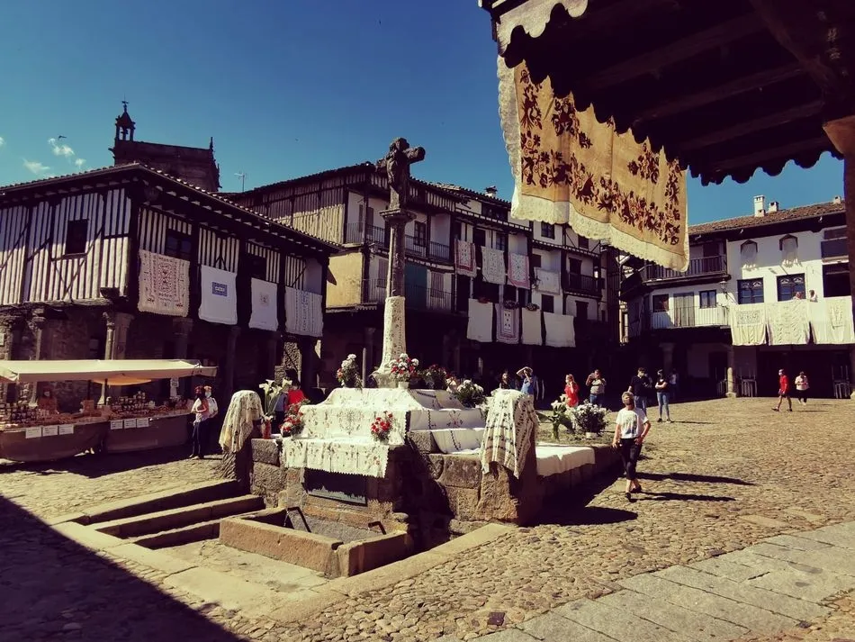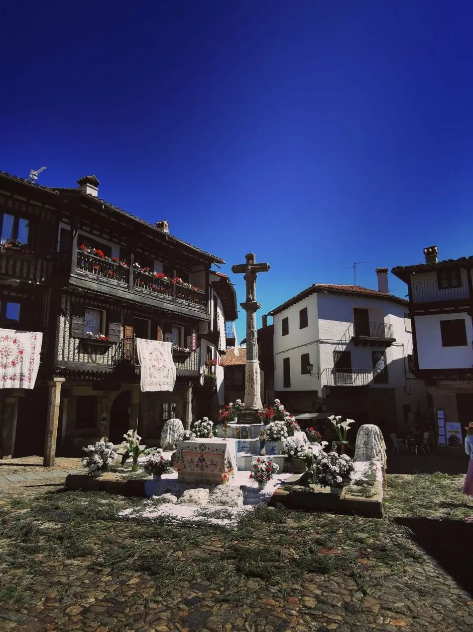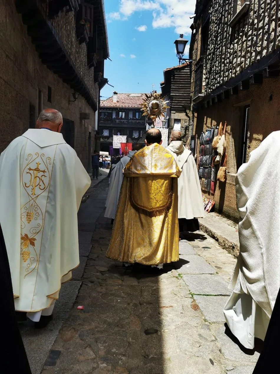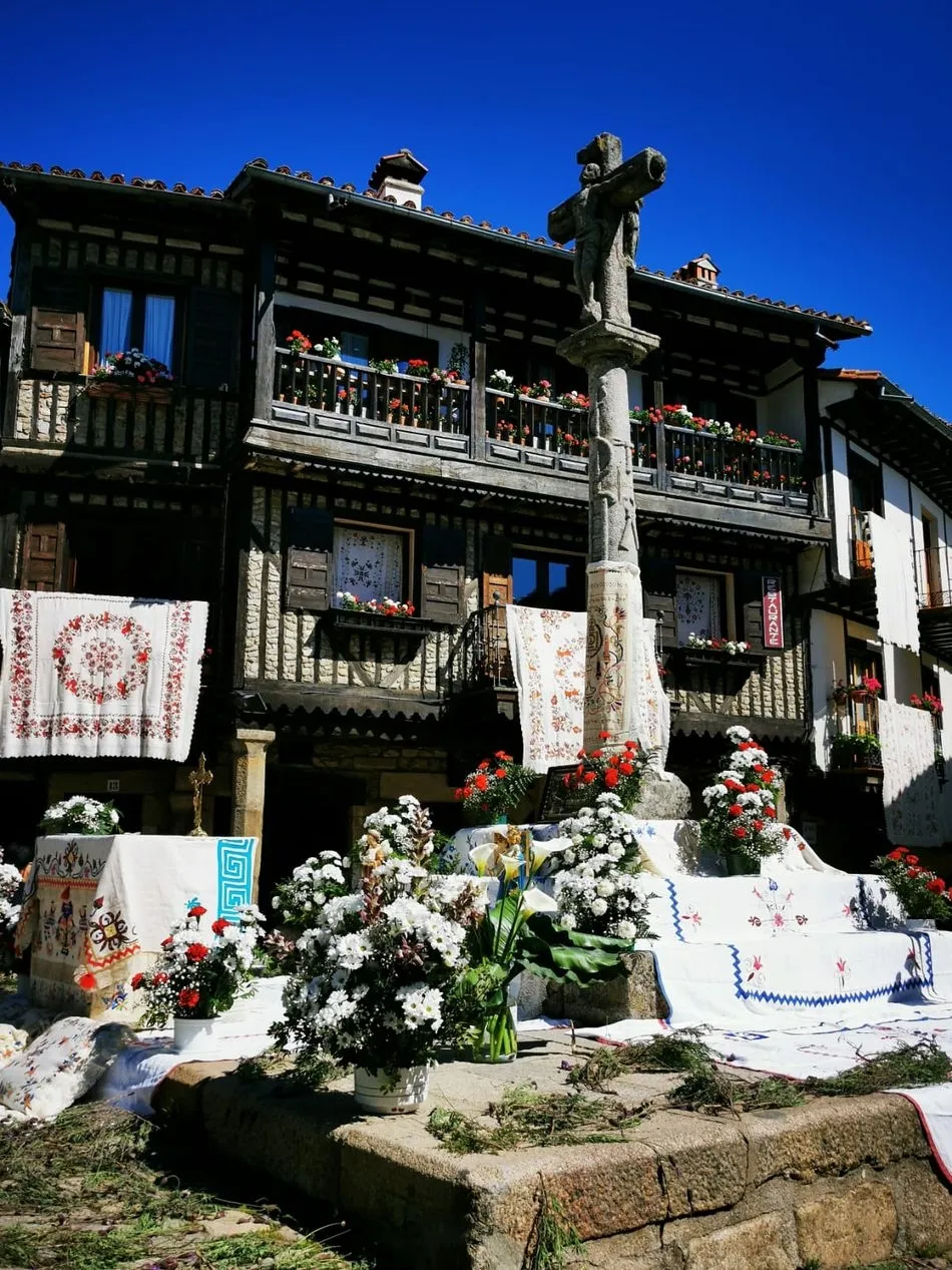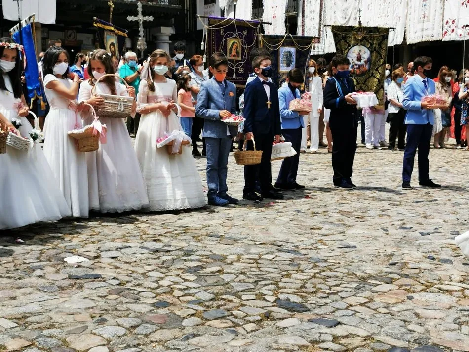 os que se recorren los cinco altares ubicados por todo el centro, en esta ocasión solo se trasladó la comitiva hasta la Plaza Mayor donde fue ubicado uno de los altares. Como manda la tradición, los vecinos adornaron sus ventanas y balcones con motivos serranos contribuyendo al espectacular aspecto festivo de la localidad pese a las limitaciones actuales por la pandemia de coronavirus.
