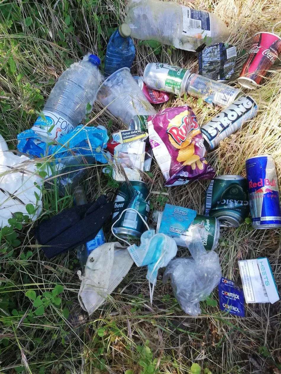En mi caso me metí un poco más cerca de la orilla del río entre algunas zarzas para hacer una batida. Allí recogí pañuelos de papel, latas de bebidas energéticas, envoltorios de preservativos varios, mascarillas, latas de cerveza, envoltorios de sanwiches...