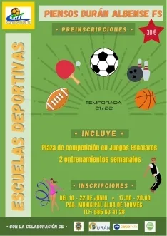 El Piensos Durán Albense ha abierto las preinscripciones de sus Escuelas Deportivas para la próxima temporada. Todos los niños y niñas, de entre tres y dieciocho años de edad, que deseen practicar algún deporte de los ofertados por el club (fútbol sala, multideporte, gimnasia rítmica, baile moderno, baloncesto o danza urbana) podrá formalizar su preinscripción en las oficinas del club situadas en el pabellón municipal hasta el próximo 252de junio en horario de 17:00 a 20:00 horas.